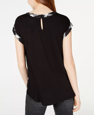 BCX Juniors' Plaid Woven-Front Cutout Blouse Black Size X-Small