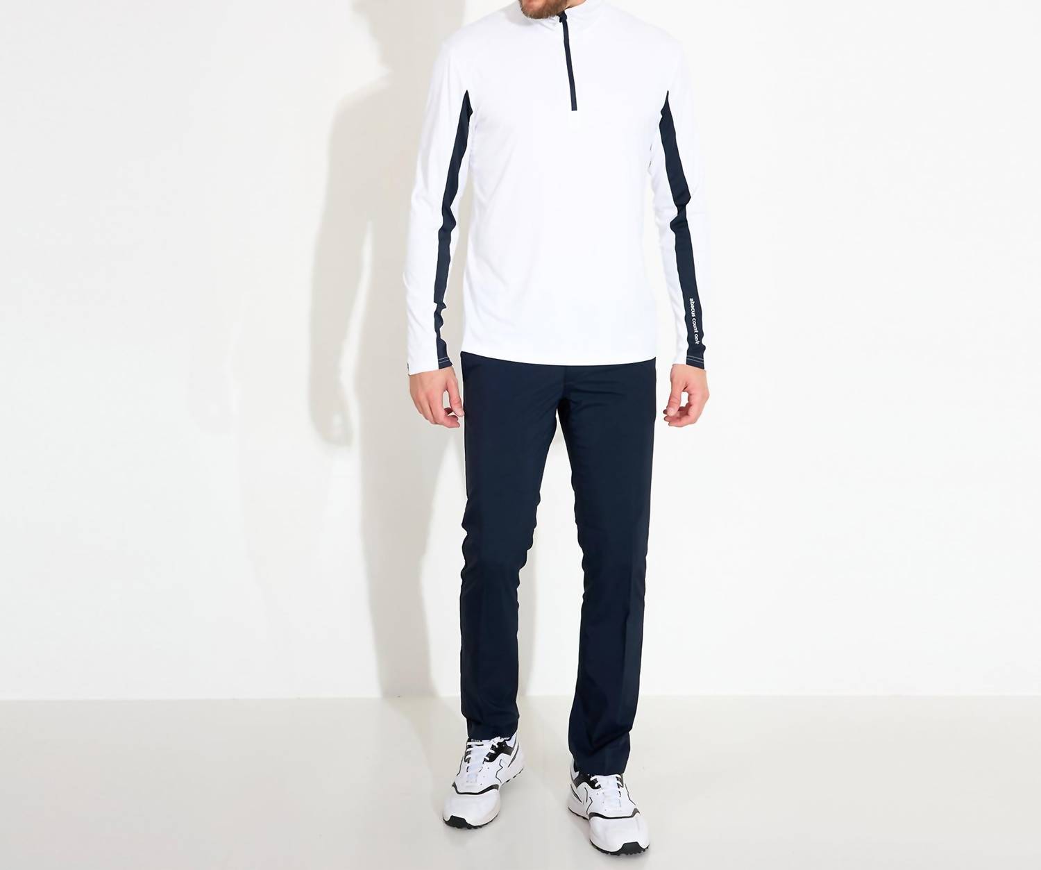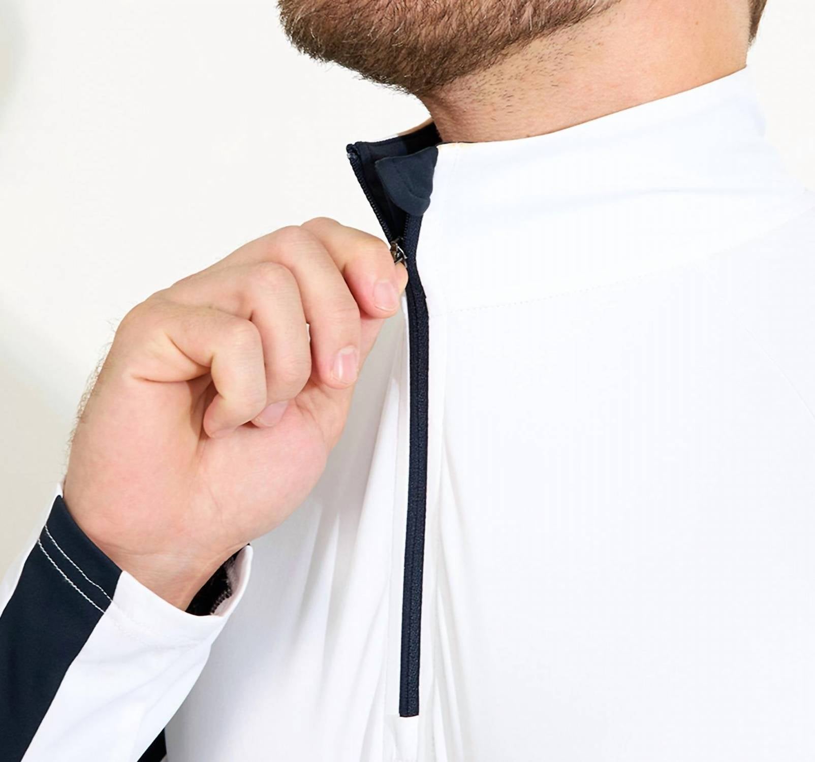 Stay protected and stylish on the golf course with the Aloha UV Cut Long Sleeve Shirt by Abacus Sportswear US. This long sleeve garment in white/navy features high-density yarn offering UPF 50 protection without chemicals, ensuring durability against sun exposure. Made from lightweight, stretchy nylon, it is designed with a polo collar and sporty contrast stripe, featuring a zip closure for easy wear. Care: Machine wash and line dry. Perfect for summer athleisure and game day, this shirt is a must-have for any golfing enthusiast.
