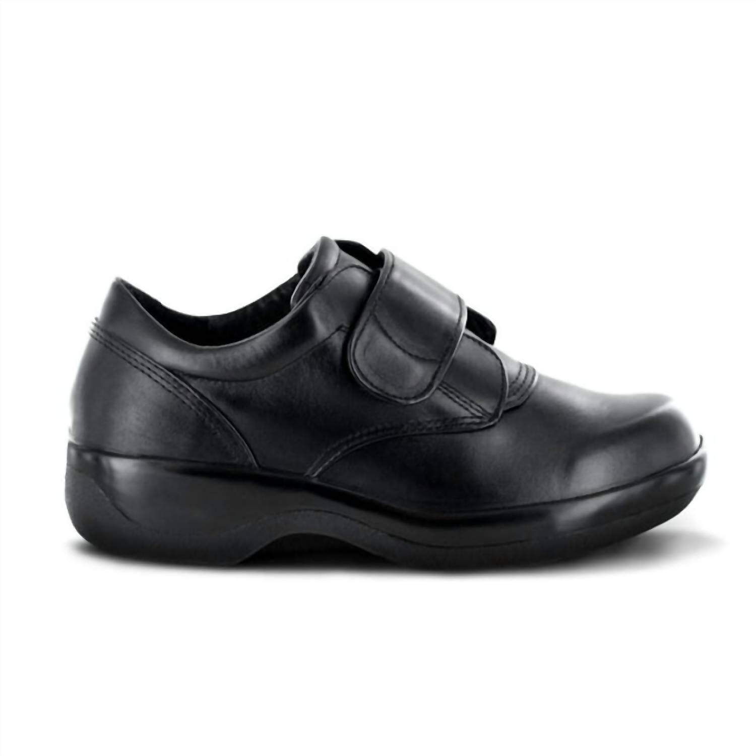 Get your daily steps in with these adorable sneakers. Experience unparalleled comfort with the Women's Ambulator Single Strap Casual Shoes by Apex, crafted meticulously in black leather. These sneakers feature a VELCRO® closure system for easy fitting and a soft, padded collar to minimize ankle irritation. Designed with a high, wide toe box for extra room and a biomechanically engineered Hidden-Depth Rocker Sole, they ensure an eased stride. The slip-resistant polyurethane outsole and the included removable lightweight comfort orthotic add to the shoe's appeal, making it perfect for those with specific health needs.
