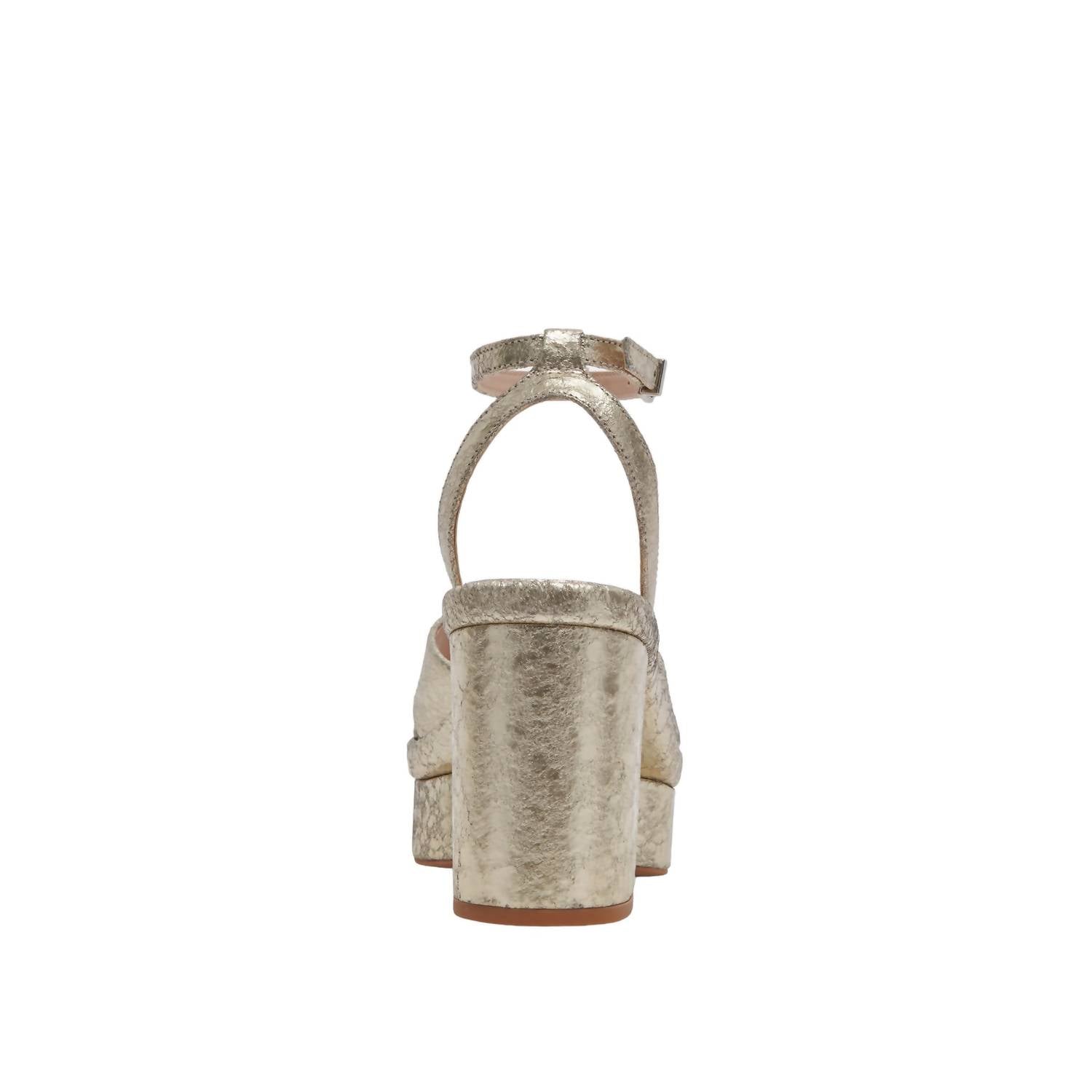 Flowy dresses, cropped pants, and even jumpsuits... this sandal works with them all! Laisha's chunky platform heel is perfect for a night out. It features a metallic crinkle patent finish with a leather upper, synthetic outsole, lining, and sock. Heel height: 3.4", platform height: 1.2". Imported.