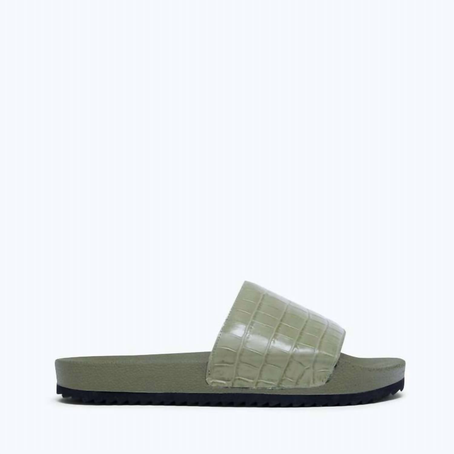 This sandal will take you from brunch to dinner and everything in between. Elevate your summer wardrobe with the Women's Lea Slides by FREDA SALVADOR, crafted from 100% Italian leather in a eucalyptus embossed croc design. These slip-on sandals boast a lightweight molded footbed and a water-resistant rubber lug sole, providing both style and function. The buttery soft leather lining ensures all-day comfort, making them perfect for streetwear trends. Featuring a flat 1" heel and an open toe shape, these slides are ideal for women seeking effortless elegance.