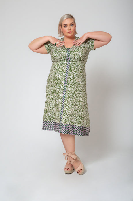 Final sale items cannot be returned or exchanged| Our Francesca dress now with a subtle banded detailing| adding a sweet touch to this effortless summer dress| The Francesca is calling out for picnics| walks in the park| soaking in the sun's rays| It's fitted in the bodice with chic details like rolled short sleeves and button accents