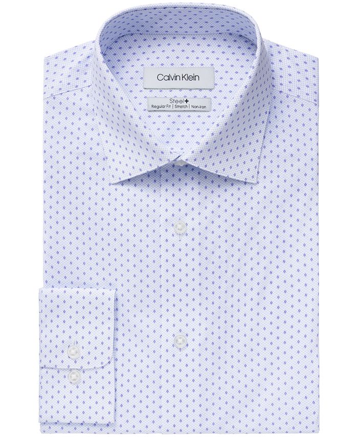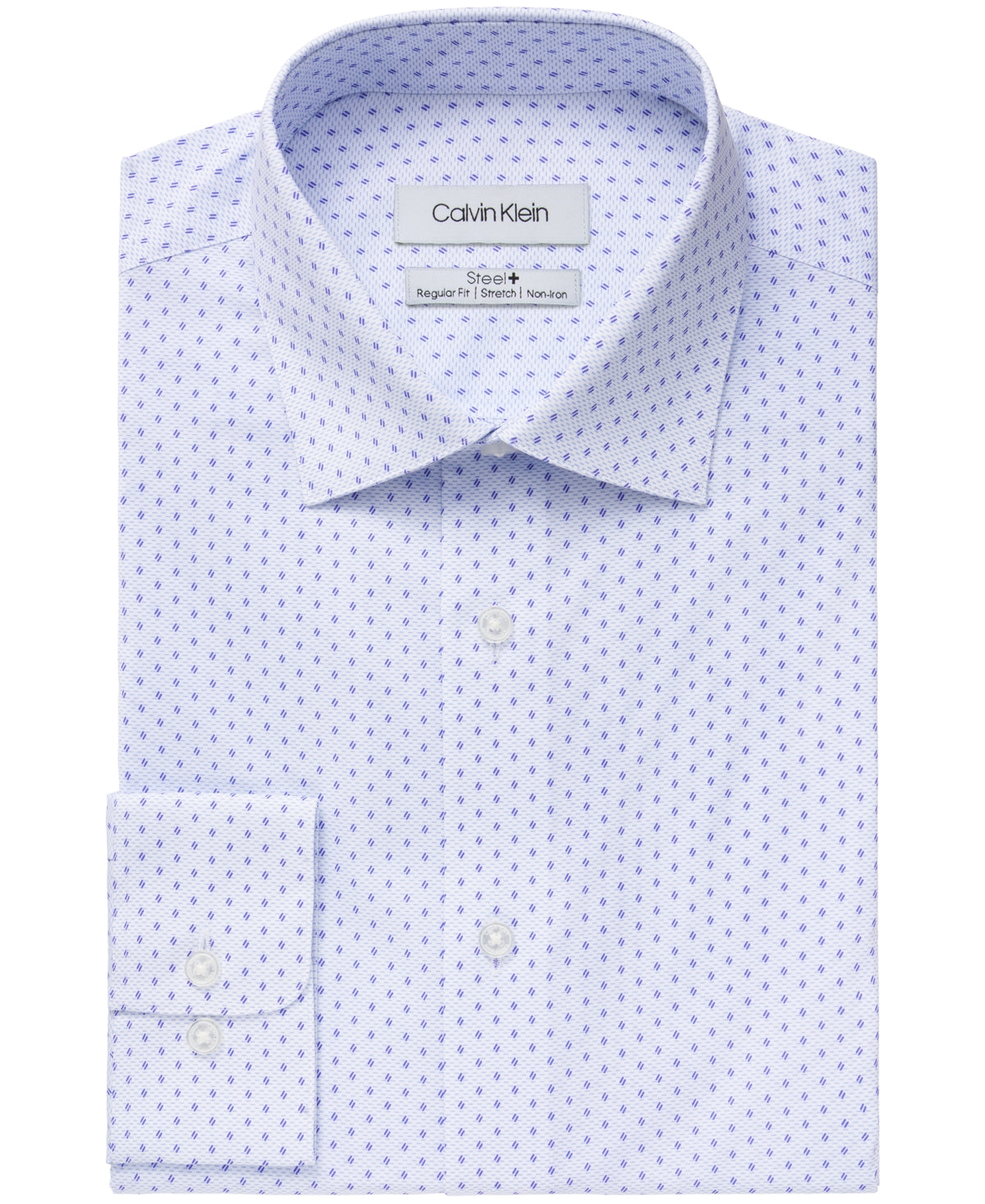 Be both comfortable and stylishly fresh with this STEEL dress shirt by Calvin Klein. Tailored in a classic cut| its double dash patterning lends it modern visual appeal while stretch| moisture wicking fabric works to keep you comfortable.| A classic fit| also known as a regular fit| offers a generous cut throughout the chest and waist for overall ease; features standard armholes and fuller sleeves| Non-iron