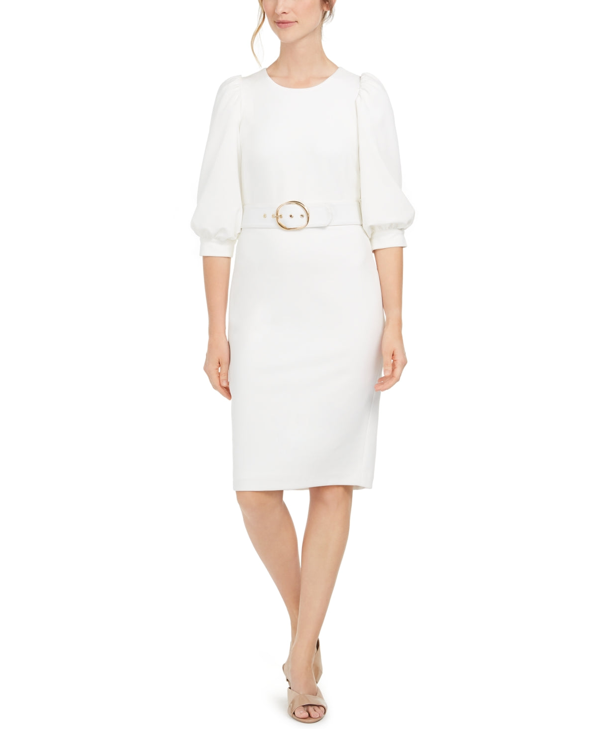 The perfect updates. Balloon sleeves and a sophisticated belt elevate this traditional sheath dress by Calvin Klein. | Approx. 39-3/4 long from center back neck to hem. Length is based on size 6 and varies 1/4 between sizes| Tailored fit through the chest| waist| and hips; sits close to the body| Scuba crepe; Stretchy and supportive| Round neckline; Sheath silhouette