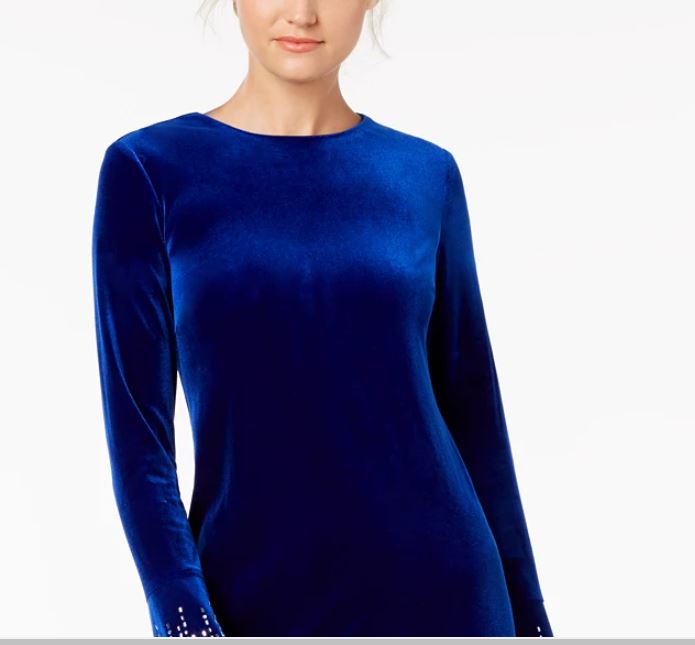 Approx. 32" long from center back neck to hem. Length varies 1/4" between sizes|Designed to fit and flatter 5'4" and under frame|Round neckline; Sheath silhouette|Hidden back zipper with hook-and-eye closure|Long bell sleeves with beaded cuffs|Allover velvet|Unlined