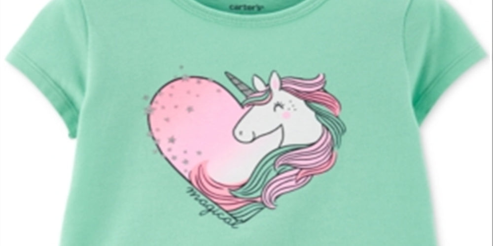A unicorn and heart make a magical impact on this super-fun| lightweight cotton peplum T-shirt from Carter's.| Crewneck| Graphic print at front| Peplum hem| 100% cotton| Machine washable