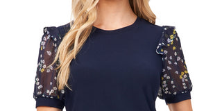 CeCe Women's Puff Sleeve Mixed Media Top Blue Size Medium