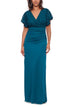 A rich tone in two textures shades Betsy & Adam's empire-waist gown with a lace bodice atop a ruched skirt. Its formal flair is ideal for a mother or the bride or groom.| Approx. 61 long from shoulder to hem. Length is based on size 4 and varies approx. 1/4 between sizes.| Full-length formal dress| Lace; Delicate and light texture| Surplice V-neck; Gown silhouette| Zipper at center back| Short flutter sleeves