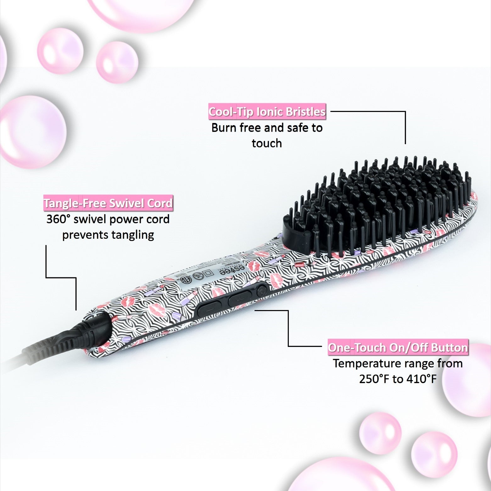 HAIR BRISTLE STRAIGHTENER - Powerful ceramic heated plates evenly distribute heat, providing instant recovery, delivering super-straight, shiny hair in one stroke. | SMOOTH, SHINY AND FRIZZ-FREE! - Anti-frizz technology and heat resistant panel can protect your skin from burning, you can enjoy straightening your hair without any worries. | 90 MINS AUTO SHUT OFF - If you occasionally forget to unplug it, it will automatically shut down after 60 minutes. | TANGLE-FREE SWIVEL CORD - The design of the 360-degree swivel power cord prevents tangling, and flexible for easy styling and movement. With a wall hanging hole allows you to hang it where you can easily get it. | DIFFERENT TEMPERATURE SETTINGS - The adjustable heat temperature from 250°F to 410°F allows you to match your specific hair type: thin, fine, wavy or curled.