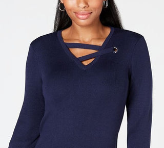 JM Collection Women's Grommet Trim V Neck Top Blue Size Medium
