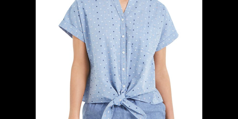 CHARTER CLUB Womens Blue Tie Front Polka Dot Short Sleeve Split Button up Top XS
