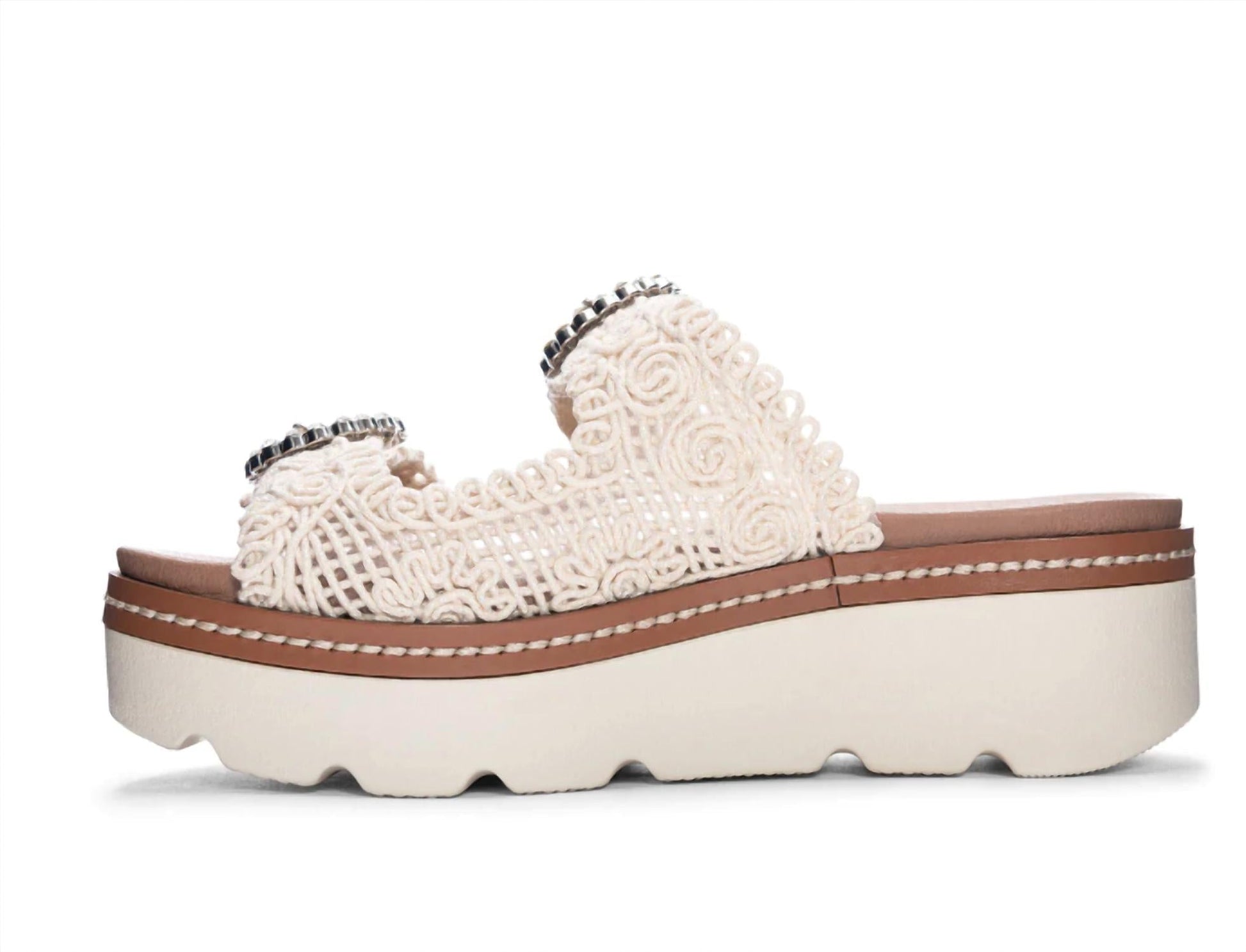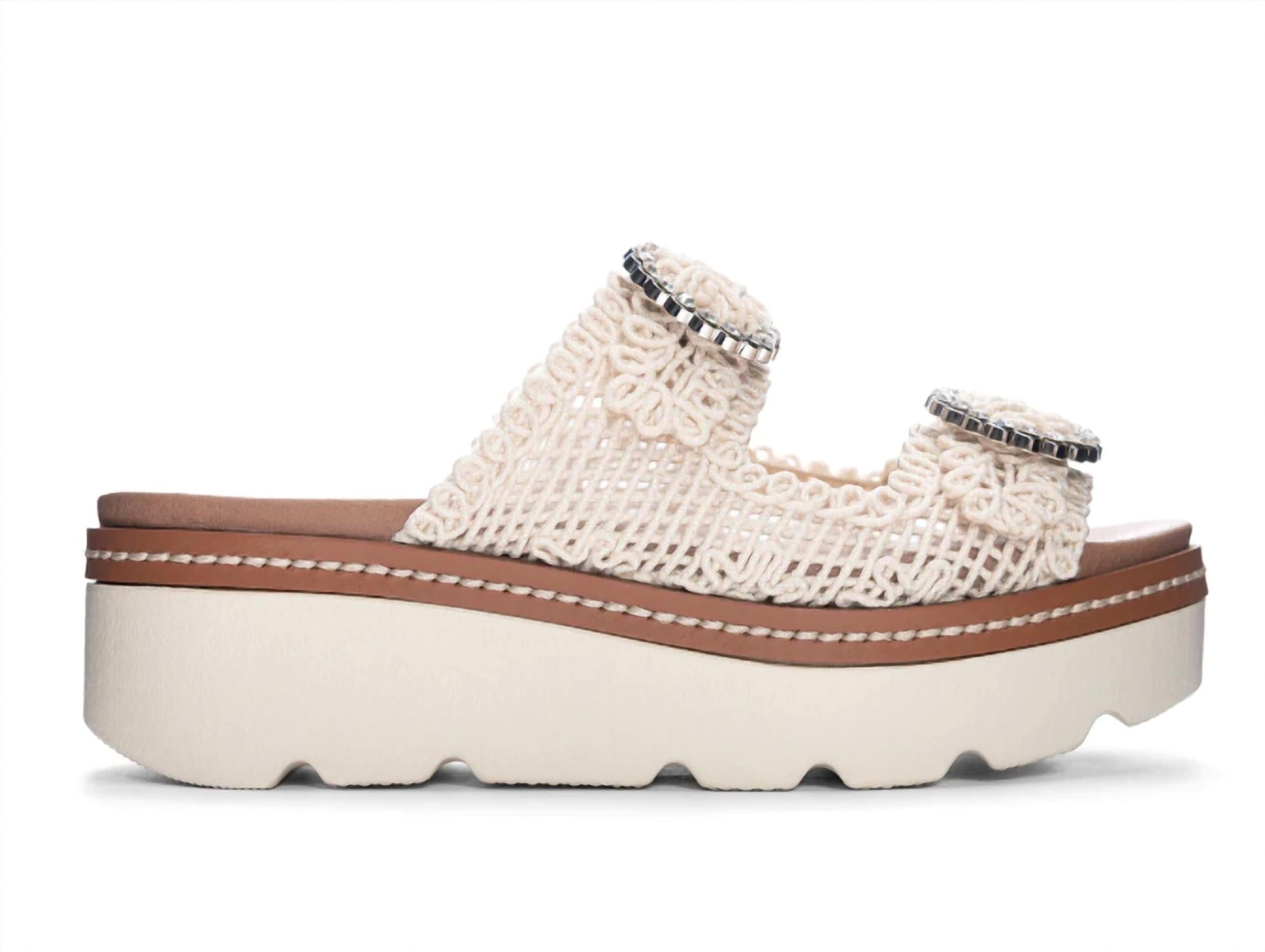 Step up your summer style with the Gia Women's Crochet Sandal by CHINESE LAUNDRY in an on-trend cream. Featuring a mid-height 2.5" platform wedge heel, these sandals boast rhinestone-embellished silver buckles and an intricately woven lace-like upper, epitomizing boho chic. Designed with a cushioned insole for comfort and a round toe shape, they are crafted from high-quality manmade materials. Perfect for a variety of occasions, they're a must-have for your warm-weather wardrobe.