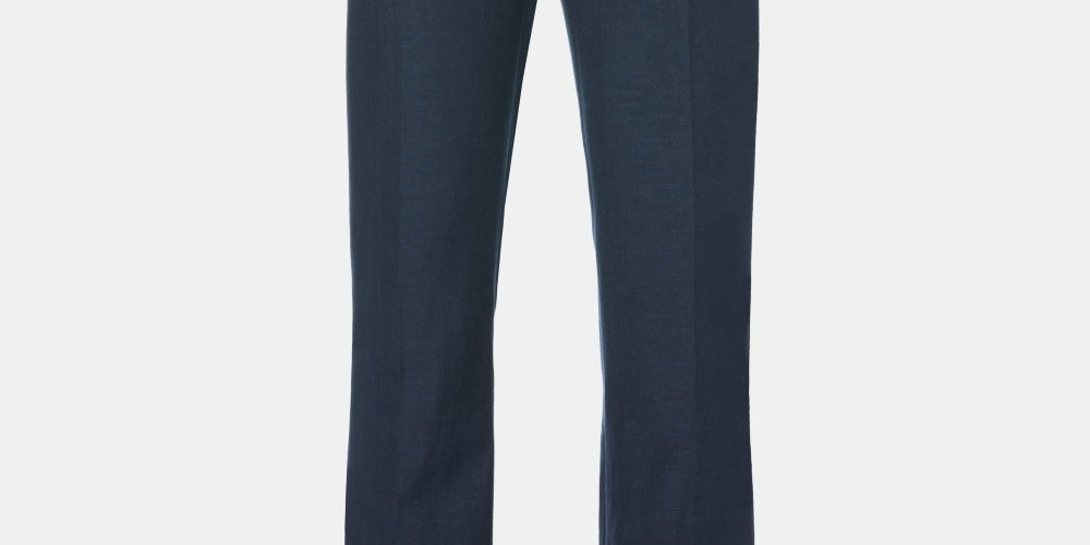 Regular fit|Inseam drop-down in sizes available 30" and 32" length.|Zip fly with flush hook and bar center flush closure; Belt loops|Quarter top front pockets; Back single welt button through back pockets|Linen/polyester/viscose|Machine washable