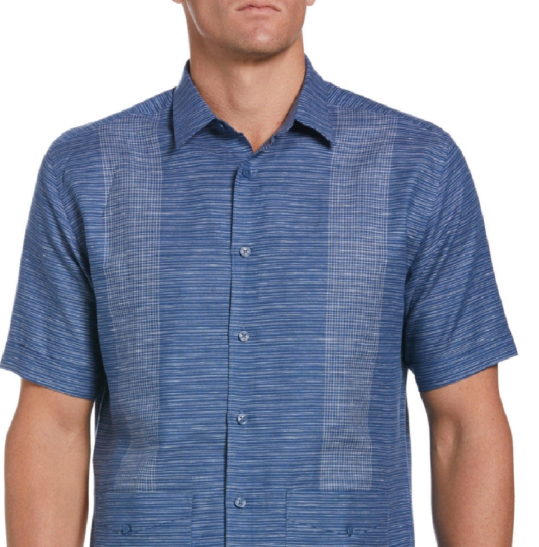 Two bottom pockets add timeless Guayabera style to this short-sleeve button-down shirt from Cubavera. Pair it with a pair of linen pants and your favorite slides for a cool casual look that stands out.| Regular fit| Point collar| Horizontal space dye panels; two bottom pockets| Linen/cotton| Machine washable| Imported