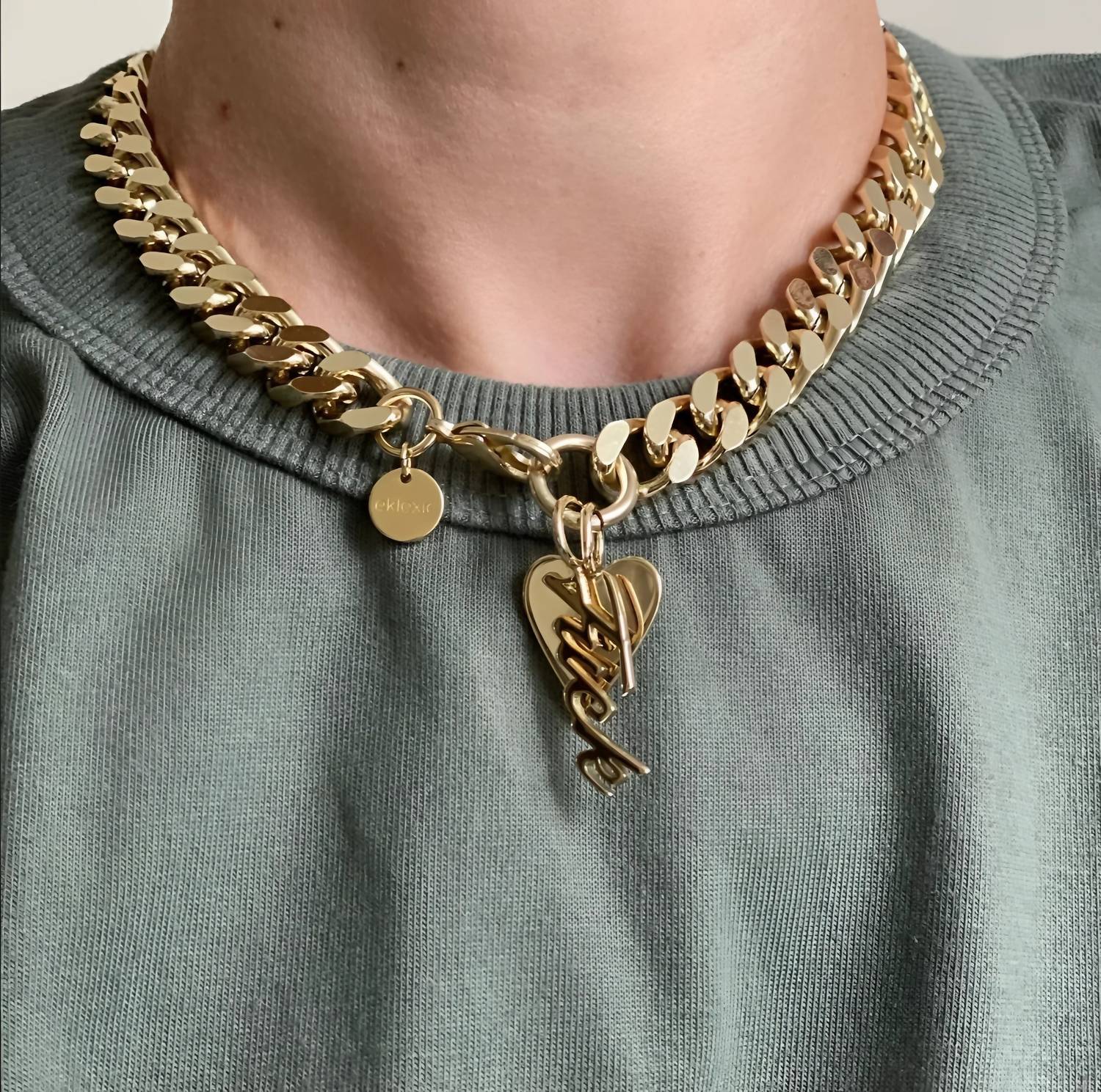 The perfect stand-out necklace that complements even the most basic t-shirt. The Charms Taraji Necklace by Eklexic is a bold and sophisticated fine jewelry piece, meticulously handcrafted by skilled women artisans in Boca Raton, FL. It features a sturdy, recycled brass Cuban link chain available in 14K Gold or Rhodium Plate with Ecoat, enhancing both luxury and durability. Each necklace is complemented by two pendants, including a daring bold script pendant with a 'Fuck' inscription, making it a powerful style statement. With a secure lobster clasp and available lengths of 14.5", 16", 18", and 20", this piece allows for personalized style and perfect fit.