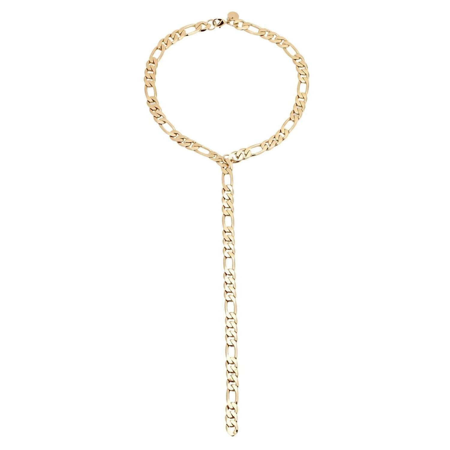 The perfect stand-out necklace that complements even the most basic t-shirt. Discover bold sophistication with the Women's Axel Lariat Necklace by Eklexic, a standout piece in radiant gold. This fine necklace is crafted from 14K yellow gold and features a striking 16" length with a dramatic 9" drop. The design includes a 10.16mm wide recycled brass Figaro chain, finished with a 19mm chain clasp, ensuring style and security. Handmade in the USA, it embodies exceptional craftsmanship and sustainable values, ideal for layering or solo wear.