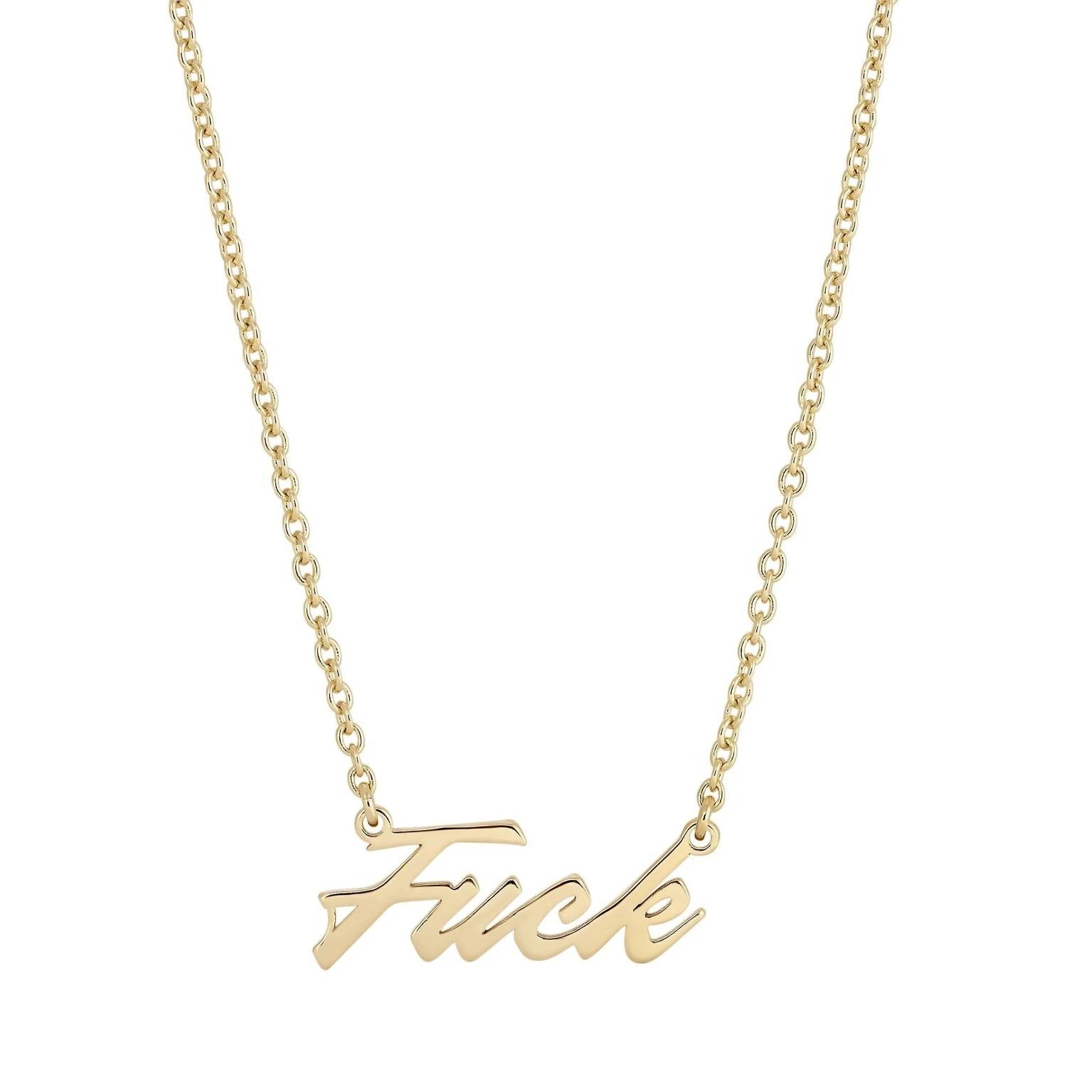 The perfect stand-out necklace that complements even the most basic t-shirt. Introducing the Women's F*ck Necklace by Eklexic, a bold statement in fine gold. Crafted from recycled brass with 14K gold or rhodium plating, this daring accessory adjusts from 16" to 20" for versatile wear. Featuring an eye-catching script measuring 12mm wide and 1.14" long, and secured with a lobster clasp. Handmade in the USA, it boasts a protective coating to maintain its shine and promises to be a sustainable and standout piece in any collection.