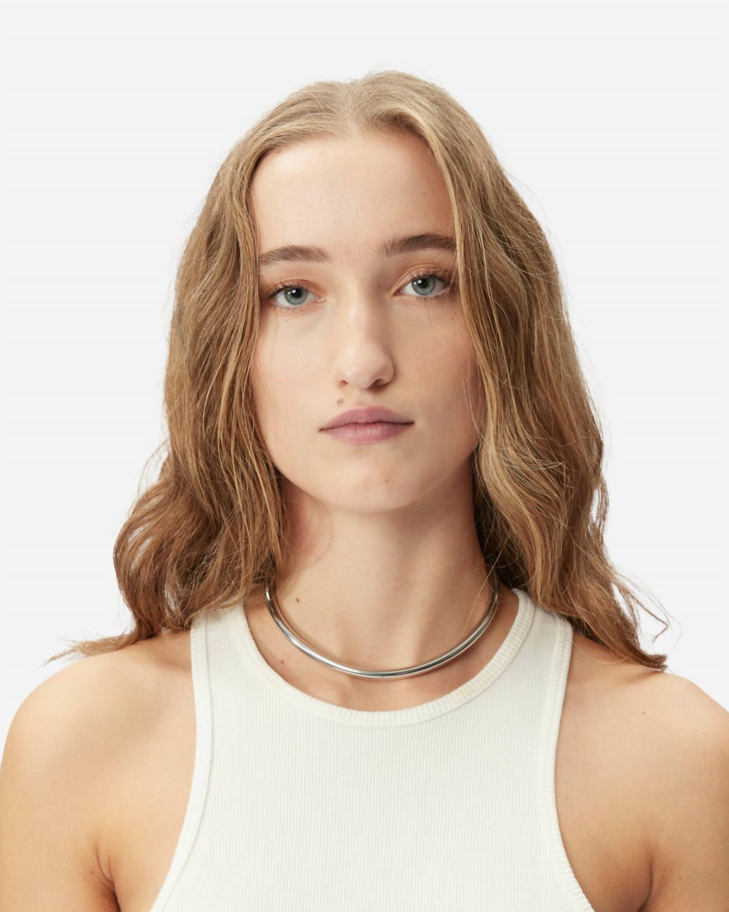 The perfect stand-out necklace that complements even the most basic t-shirt. Elevate your look with the Women's Simple Round Collar Necklace by Eklexic, a stunning piece in Silver Rhodium. Crafted from recycled brass wire, this fine necklace features an adjustable fit with a 13" length, 4.2mm thickness, and a 4.75" inner diameter. Handmade in the USA, this piece embodies high-quality, sustainable construction. Perfect for any occasion, it brings a touch of refined elegance to your jewelry collection.