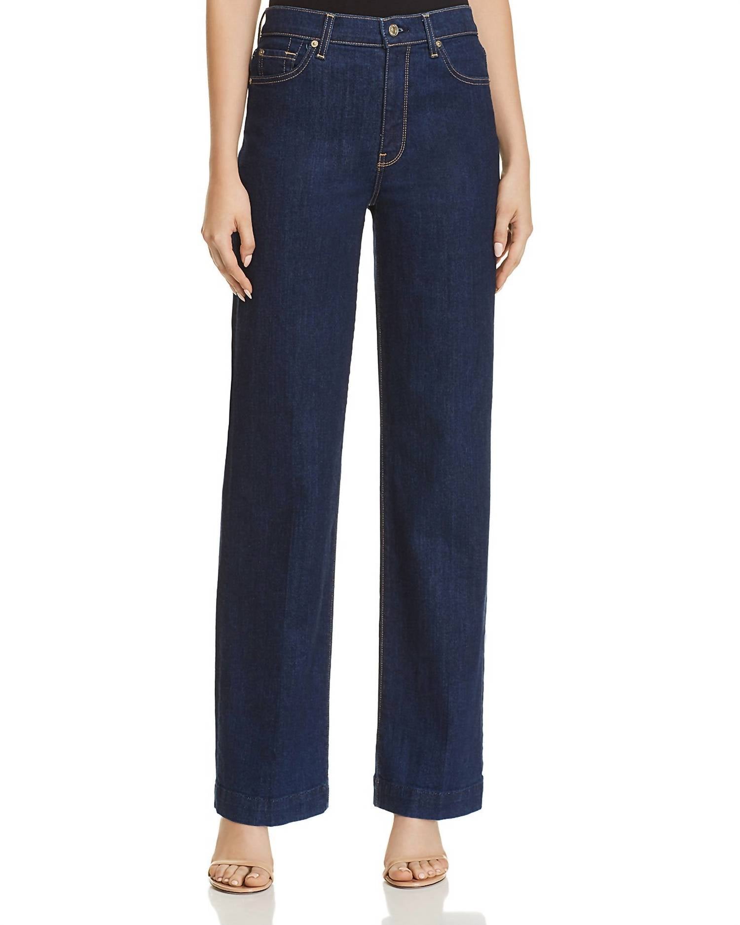 Pair these straight leg jeans with flats, sandals or even heels! You can't go wrong. The Alexa Trouser Jean by 7 For All Mankind in Avant Rinse offers a stylish high-rise fit that complements its wide-leg silhouette and banded hems. Crafted from a Cotton/Spandex blend, these jeans feature a 10.75" rise, 34" inseam, and a 19.25" leg opening, based on a size 26. Designed with contrast stitching, gold-tone logo hardware, a five-pocket silhouette, and belt loops, it also provides practicality with a zip fly and button closure. Made from imported materials, these jeans are easy to care for with a simple machine wash.