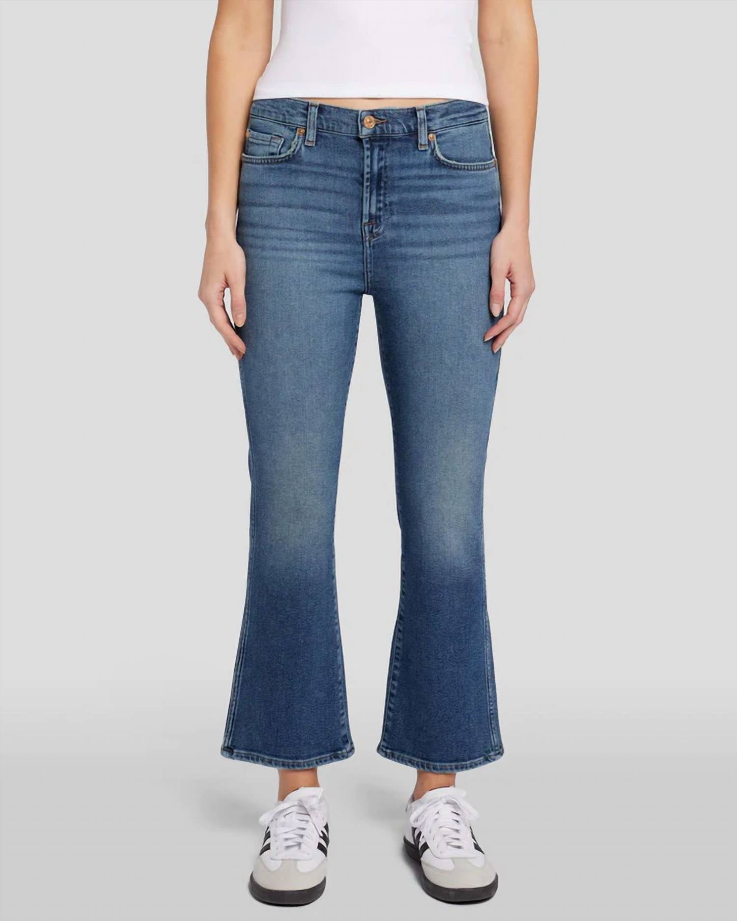 We especially love this cropped jean with a cute pair of slides or sandals. Elevate your style with the High Waist Slim Kick Jeans by 7 For All Mankind. Designed with a chic cropped kick-flare silhouette, these high-rise jeans feature a button closure and are expertly crafted from Luxe Vintage denim, a blend comprising 81% Cotton, 13% Modal, 5% Elastomultiester, and 1% Elastane. The deep blue tie-dye wash in 'Sea Level' adds a polished touch to any outfit. Care for these jeans by machine washing cold inside out with like colors and laying flat to dry. Made and imported.