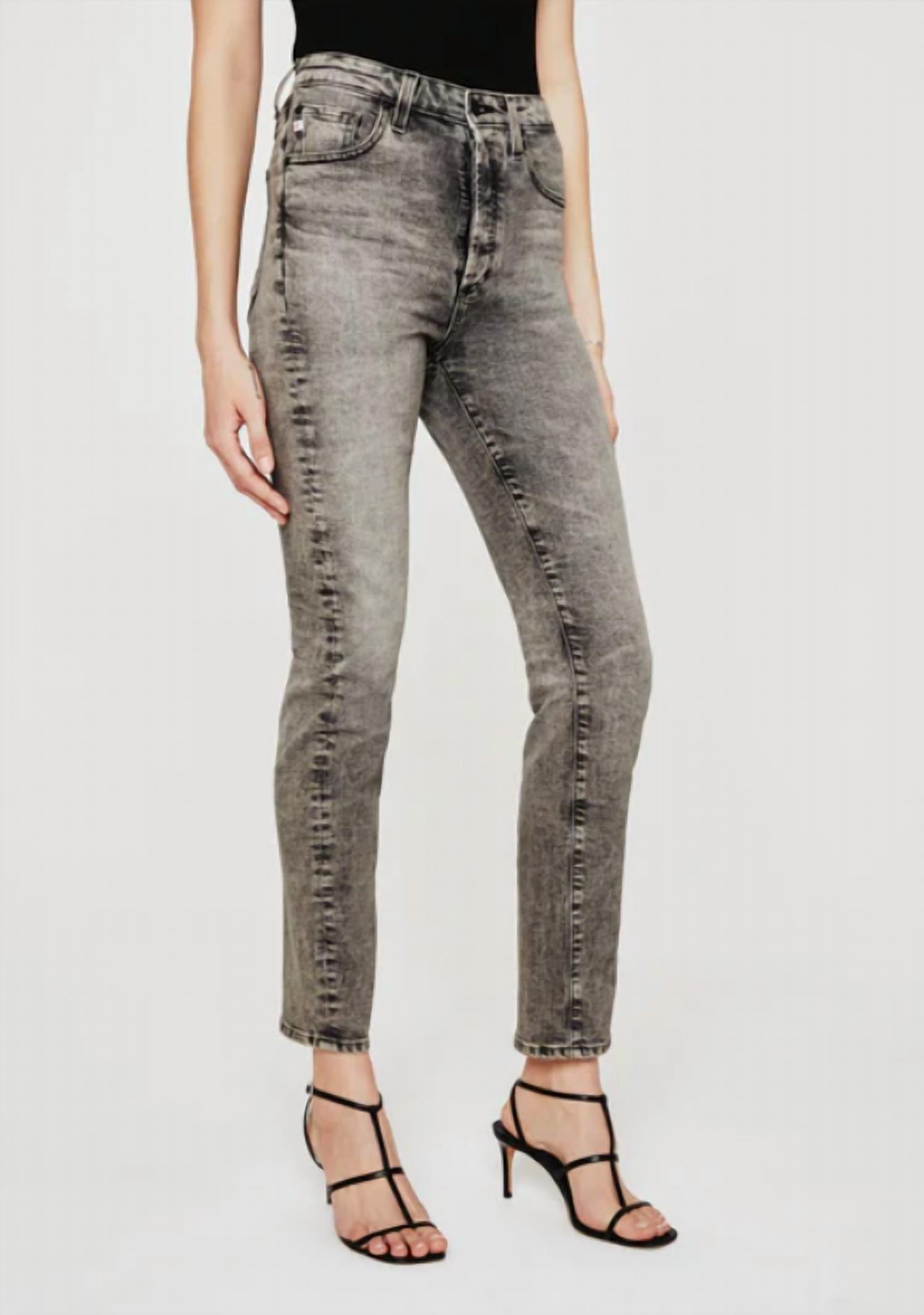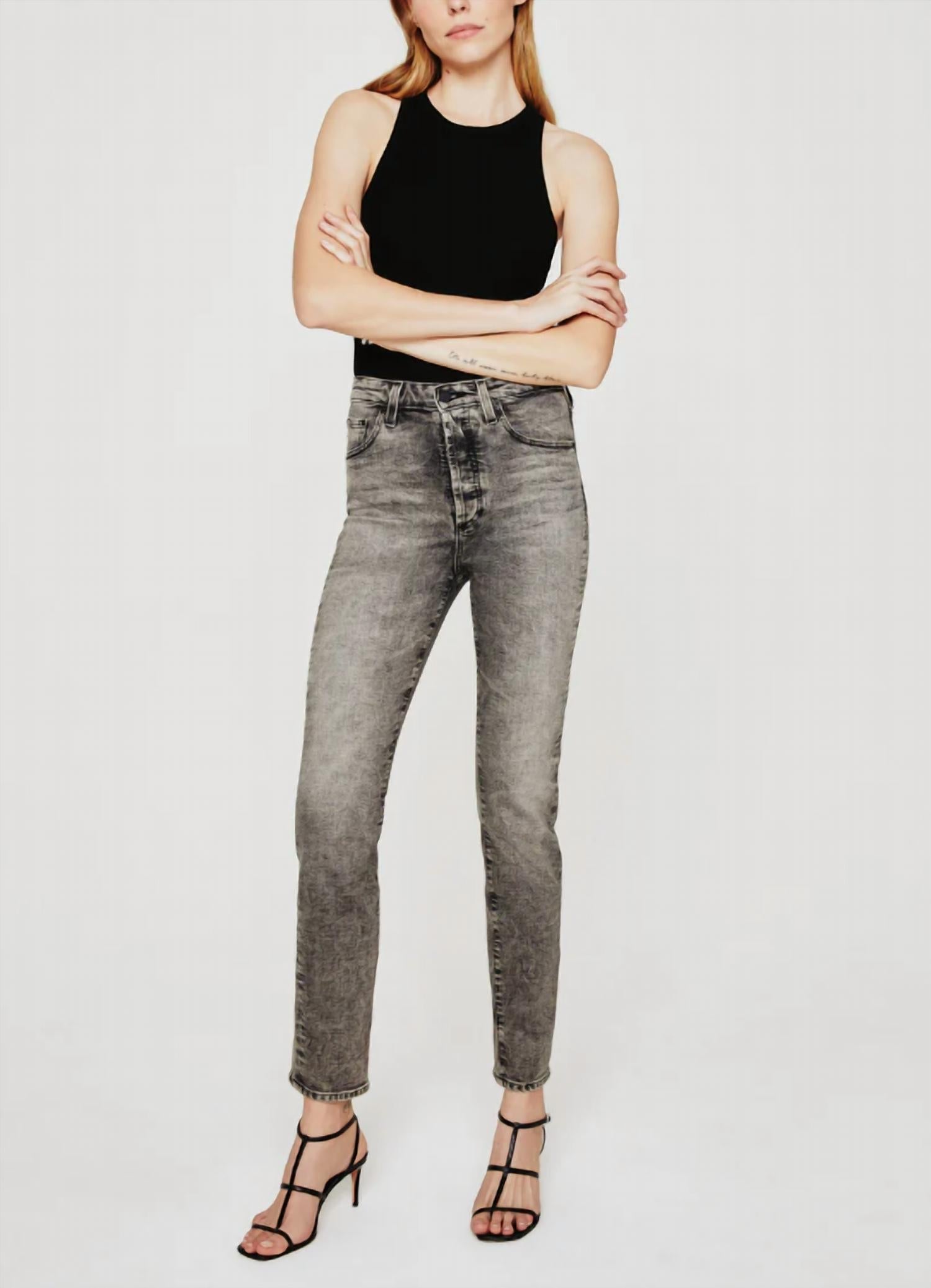 The Alexxis Slim Jeans by AG Jeans offer a sleek and stylish profile with a tapered leg and high-rise fit. Crafted from a cotton blend of 92% cotton, 6% polyester, and 2% elastane, these ankle-length jeans showcase the brand's signature AG-ed™ wash process for a naturally aged denim look. They feature a classic five-pocket design with a zip-fly and front button closure, ensuring both functionality and style. Made for women, these jeans can be machine washed and are safe for tumble drying.