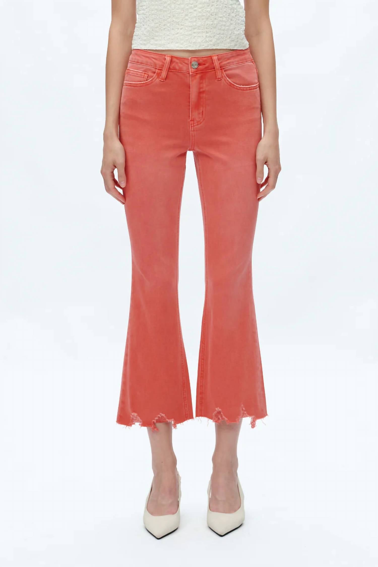 Meet the Tango Alice High Rise Crop Jeans by Bayeas, a bold addition to your wardrobe in striking tangerine. These women's jeans feature a relaxed fit with a wide leg cut and a chic frayed hem. Closure: Button closure. Care: Machine wash and tumble dry. Model Info: 5'10" height, 32.3" bust, 24.4" waist, 36.2" hips, wearing size 26/S. Perfect for a preppy spring look or an evening event, these high rise crop jeans make a stylish statement.