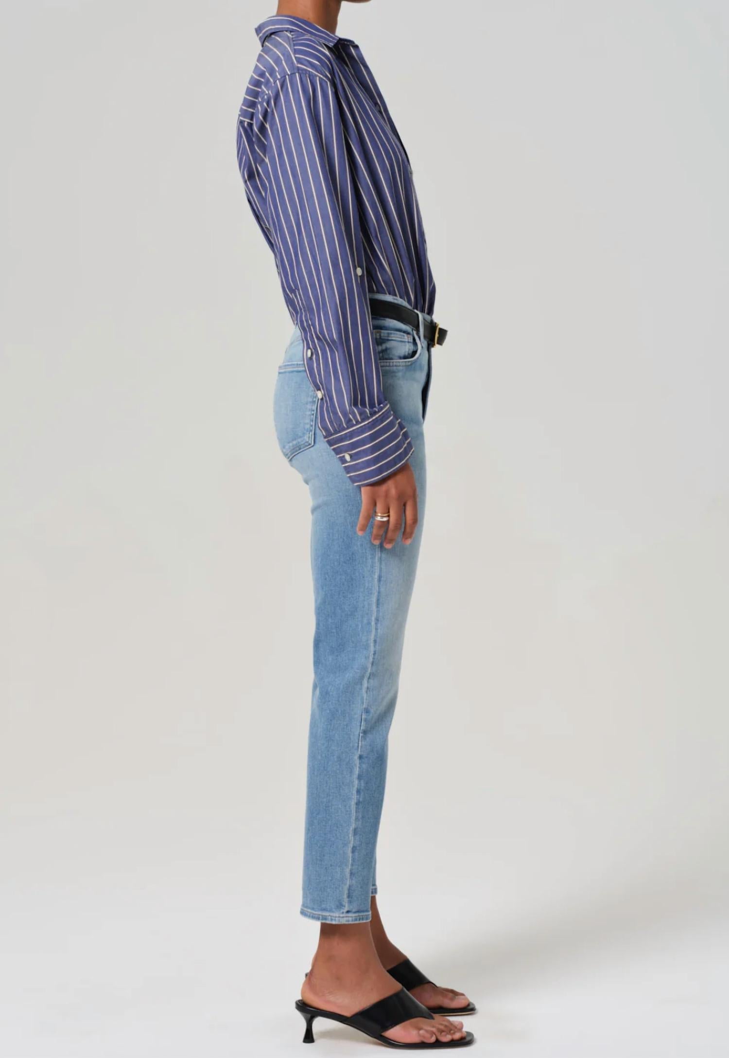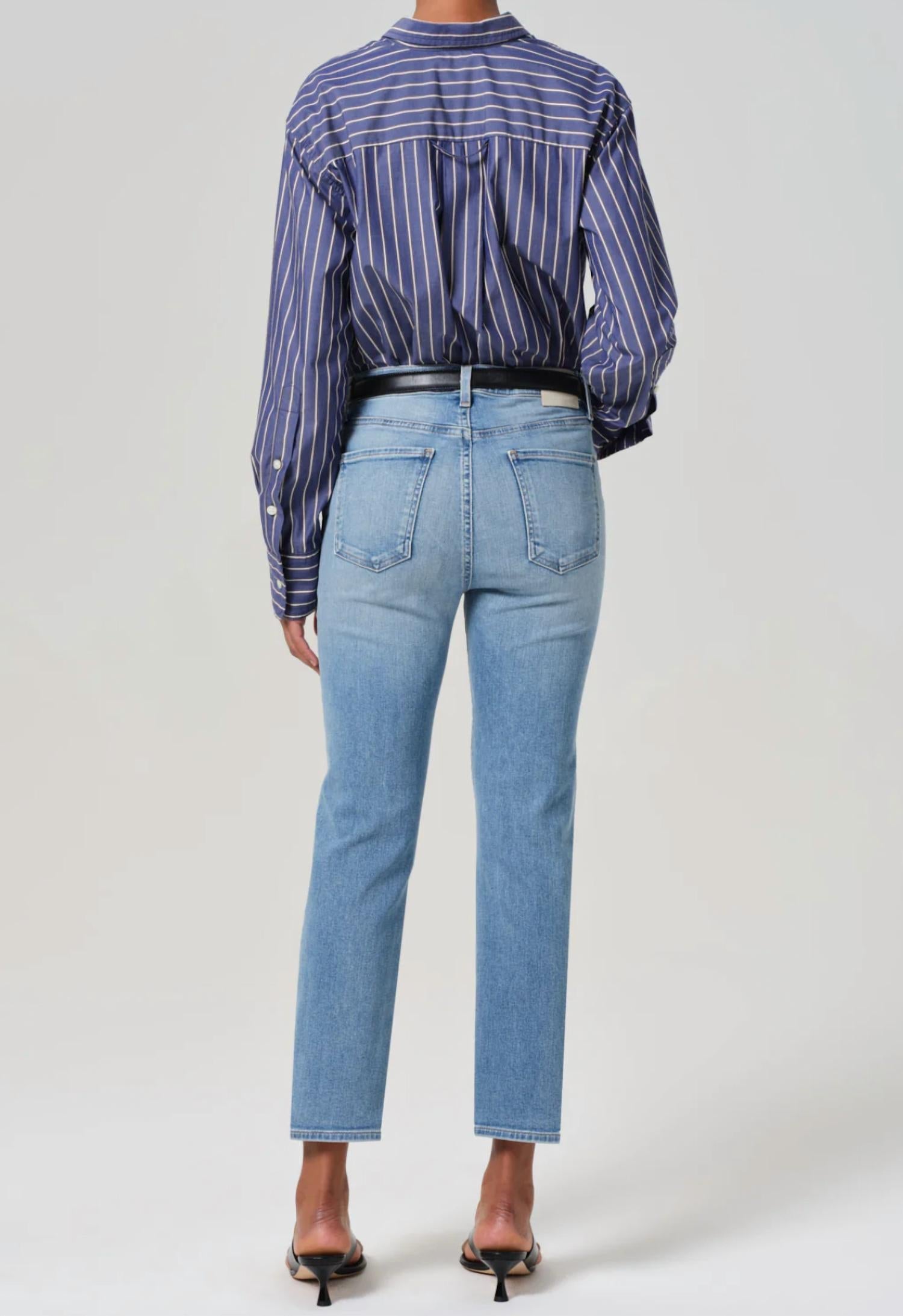 This classic straight leg jean has a perfect fit and goes with just about everything. Embrace timeless style in Tahiti. Crafted for a high-rise, slim straight fit that offers remarkable comfort and structure. Made from 98% cotton and 2% spandex. Features a light indigo wash with slight fading and whiskering. Zip fly. Machine wash cold inside out with like colors, do not bleach, tumble dry low.