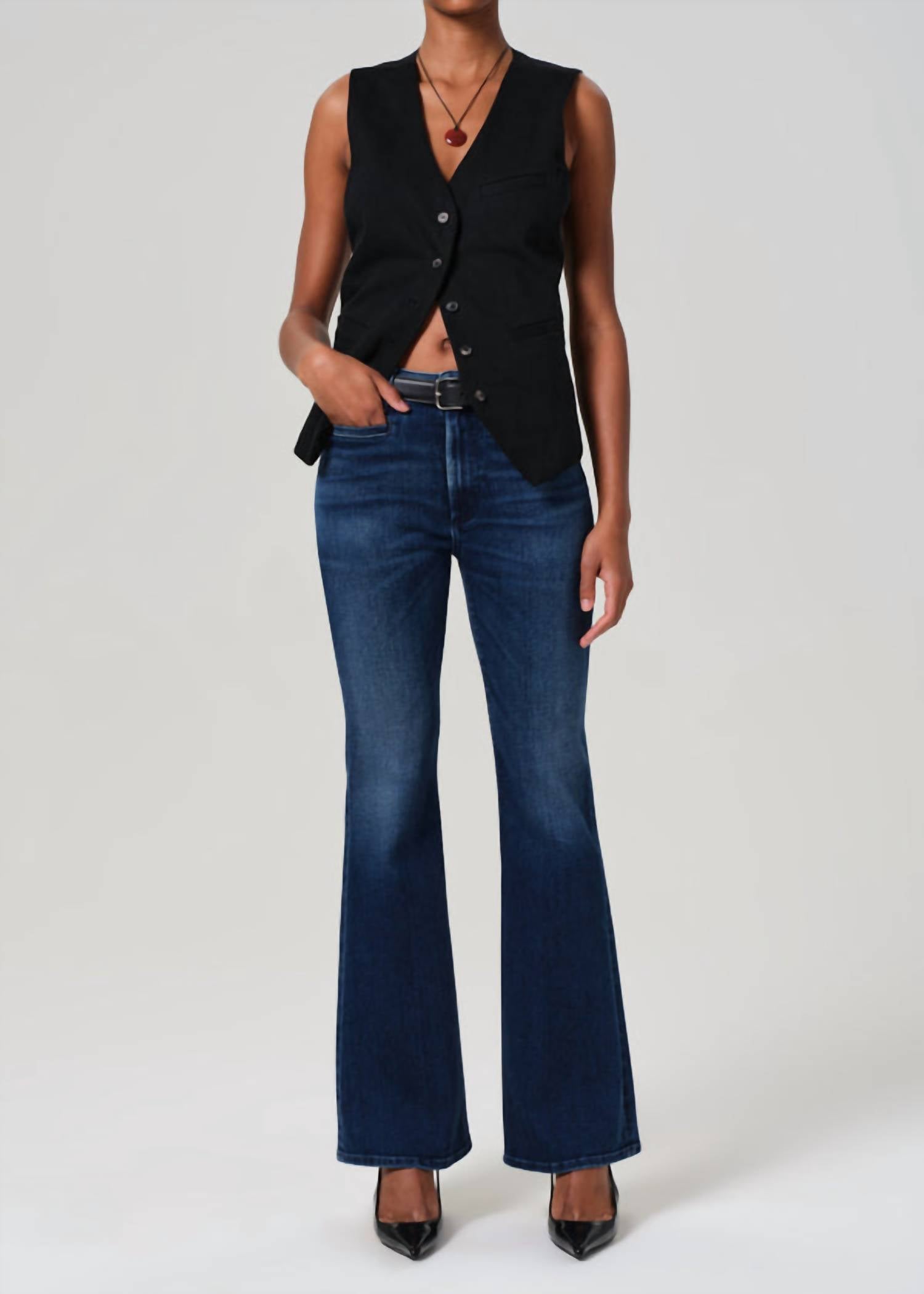 Just as cute as they are comfortable. Introducing the Lilah Flare Jean by Citizens of Humanity, a chic nod to 70s glamour. Featuring a comfort fit, these jeans are designed with a flattering flared leg, solid pattern, and functional pockets. Crafted in a premium Cotton Blend of 81% Cotton, 11% Lyocell, 9% Polyester, and 2% Elastane, they boast a rise of 11" and an inseam of 32.5" for a silhouette that elongates the legs. Closure: Button closure ensures a secure fit, making them a perfect match for a relaxed blouse and leather boots.