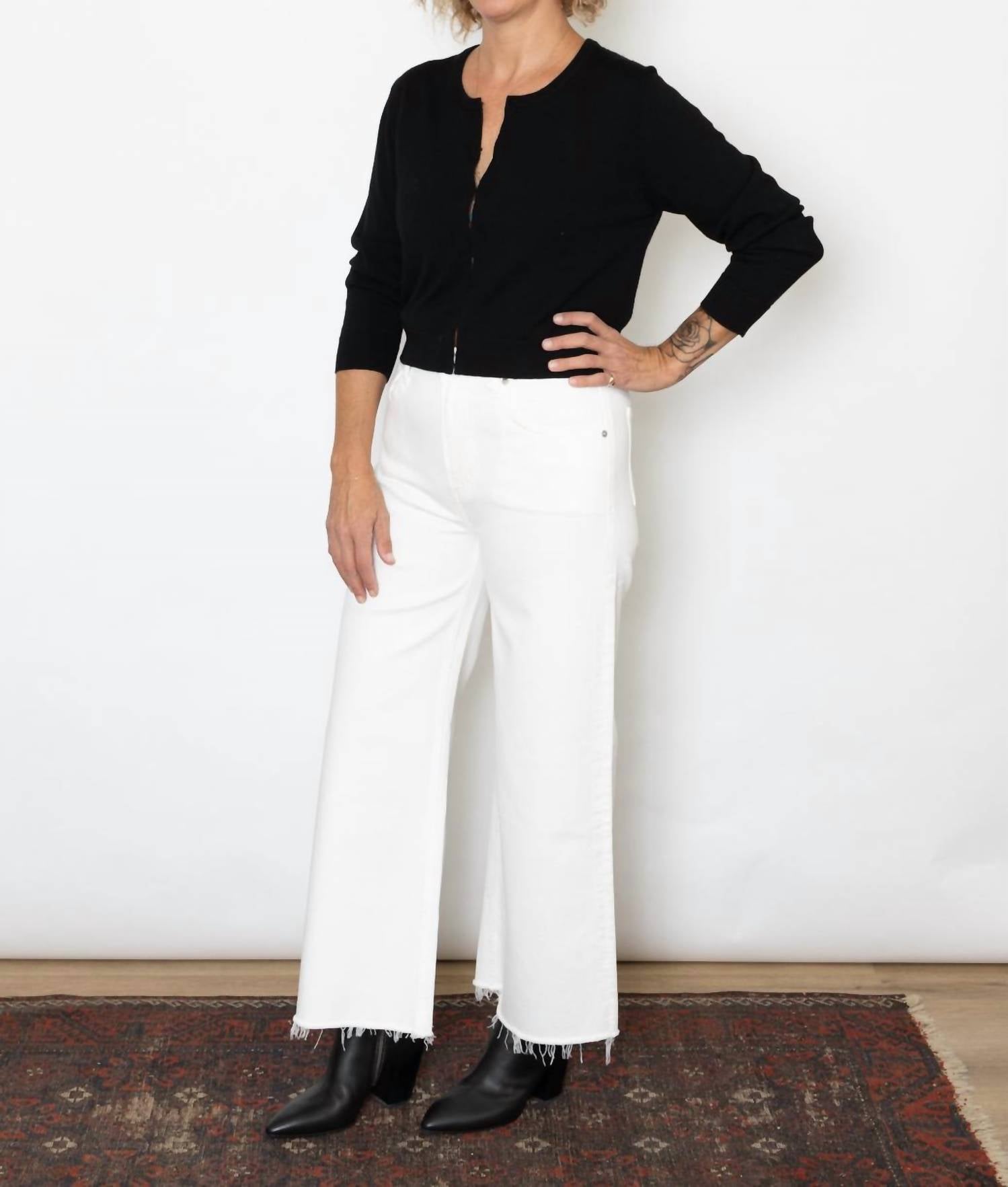 Pair these wide leg jeans with mules, slides or your favorite strappy sandals. Discover the Lyra Crop Wide Leg Jeans by Citizens of Humanity, a minimalist staple in clean white with a frayed raw hem. Designed with a high rise and wide leg, these jeans boast an inseam of 27" and a leg opening that widens to 22". Crafted in Turkey from a cotton blend (81% regenerative cotton, 11% lyocell, 6% elastomultiester, 2% elastane), they offer midweight comfort with a hint of stretch. With a zip fly button closure and a classic 5-pocket design, these jeans are machine washable and can be tumble dried, making them perfect for a dinner party or any occasion.