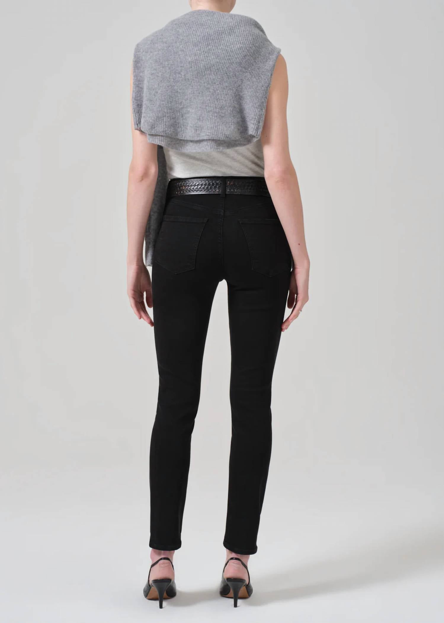 A skinny jean that is both flatering and comfortable. We love this style because it works great with boots, or without! Introducing the Sloane Skinny Jeans by Citizens of Humanity, crafted from plush black stretch denim for a sleek and flattering silhouette. These jeans feature a mid-rise and a skinny leg, complete with classic 5-pocket detailing and a zip closure for a secure fit. The composition consists of 88% Cotton, 10% Polyester, and 2% Spandex, perfect for a comfortable yet stylish look. Care: Machine wash. Model wears size 26.