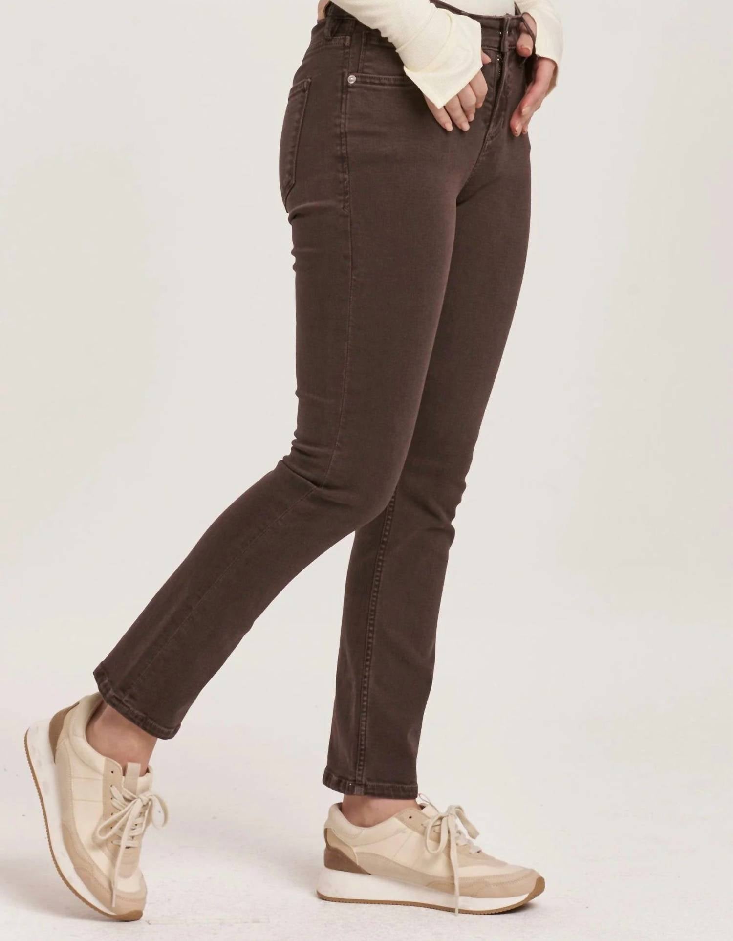Presenting the Blaire Mid-Rise Straight Leg Jeans by DEAR JOHN DENIM in a sophisticated Mocha Brown. These jeans feature a mid-rise waist with a slim straight leg style, designed for ultimate comfort and a flattering fit from hip to mid-thigh. Made from a super stretch cotton blend (90% Cotton, 8% Polyester, 2% Spandex), this pair offers a 9 1/2" front rise, 13 1/2" leg opening, and a 30" inseam in size 27. Imported and thoughtfully designed with a zip fly and button closure, these jeans include a five-pocket style for added practicality. Care for them with a simple machine wash cold and tumble dry low.