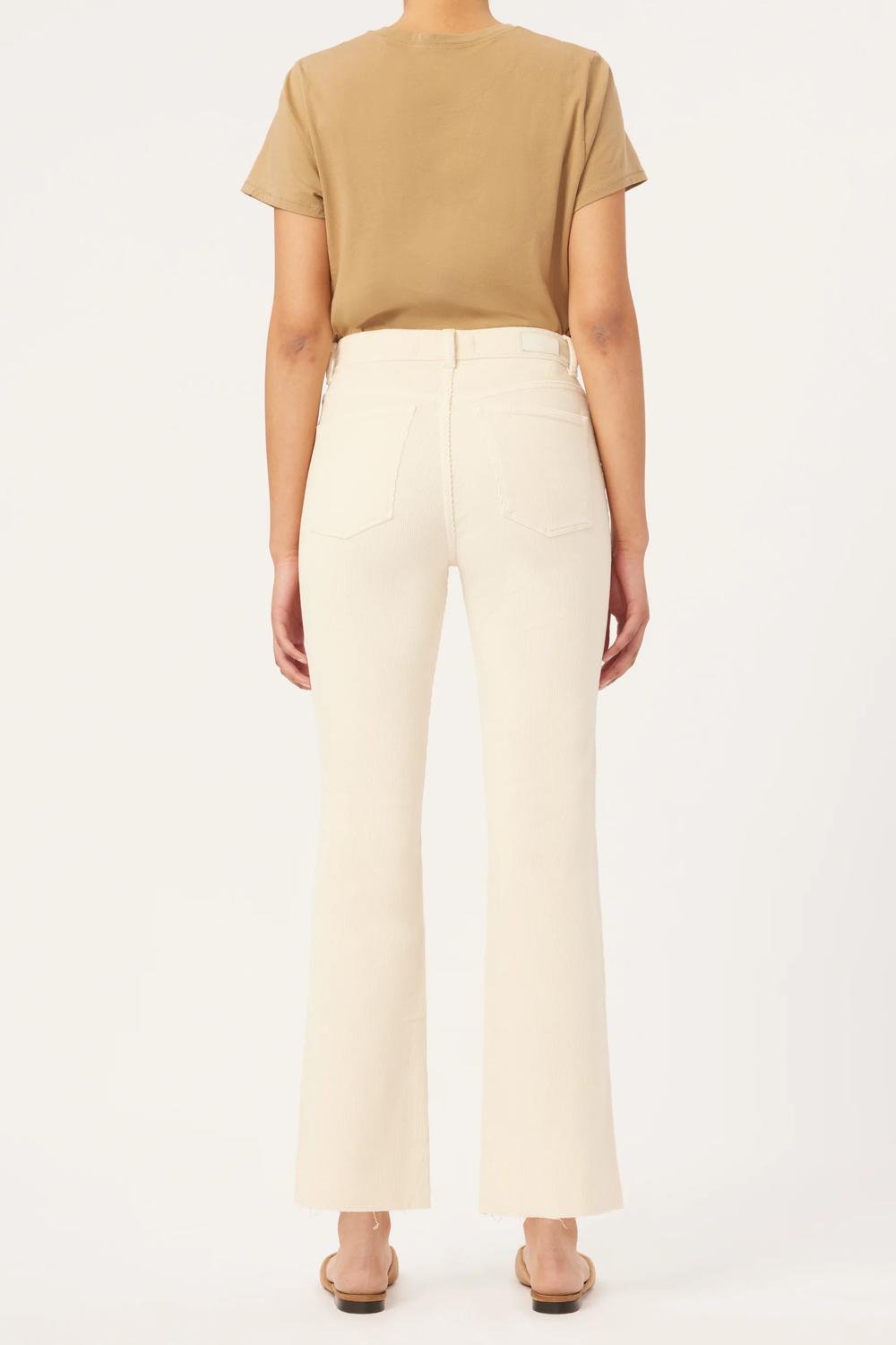 A boot-cut jean that not only looks good on, you'll be comfortable in them all day. Introducing the Bridget Crop Boot Jeans in Manilla Cord by DL1961, an elegant addition to your wardrobe that embodies minimalist style. These high-rise, relaxed-fit jeans feature a bootcut leg crafted from a cotton blend, with 98% cotton and 2% Lycra for comfort and durability. The design showcases a solid pattern with brushed gold hardware, tonal stitching, and a clean hem, finished with an ecru back patch. Closure is secured with a button closure, and for easy care, these jeans are machine washable and can be tumble dried.