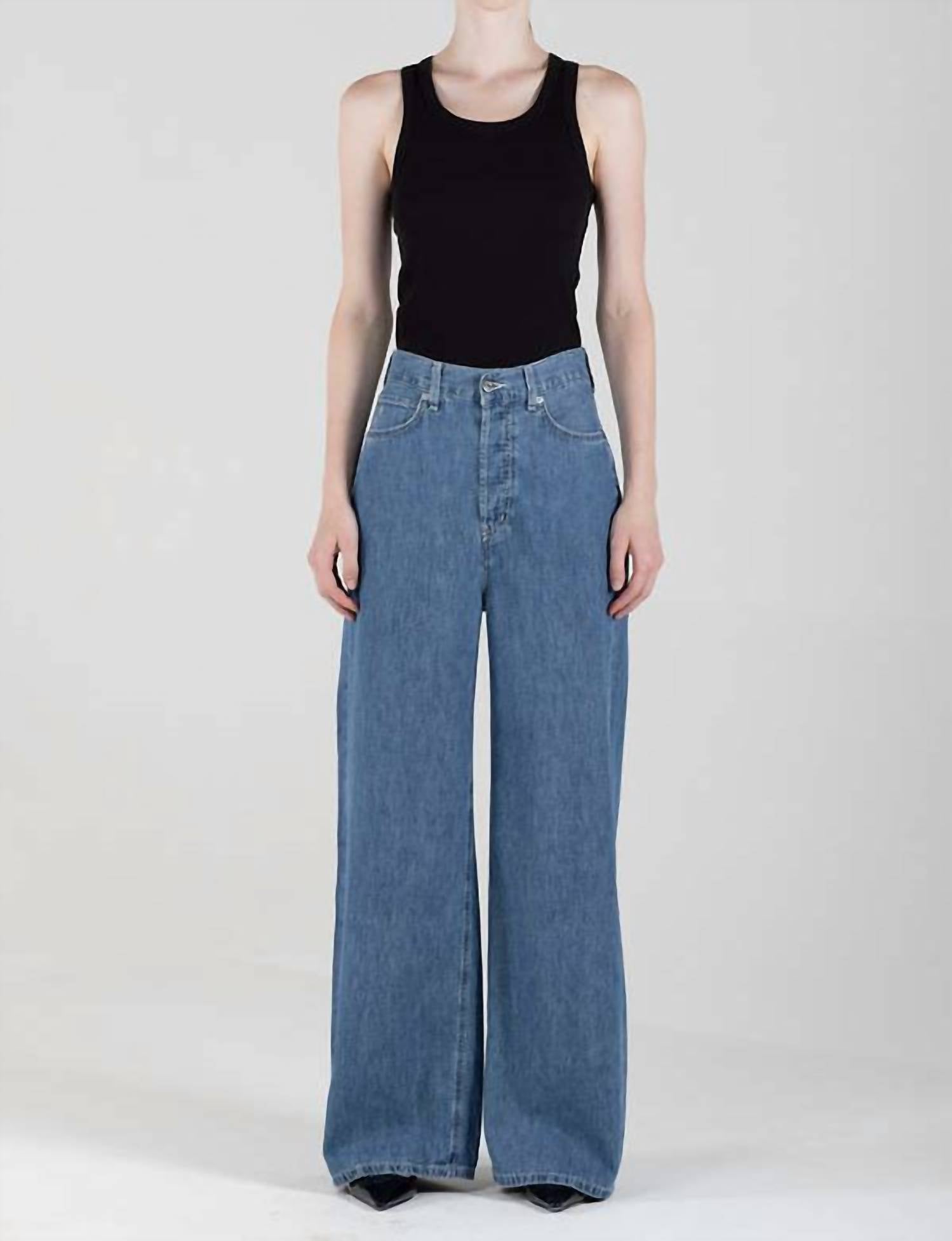 A flattering silhouette that's suprisingly versatile. Embrace relaxed style with the Marley Ultra High Rise Baggy Jean by ETICA, presented in a chic Spring Mist hue. Designed with a 13" rise and a wide leg, these jeans feature a 29.5" inseam and a 25" leg opening for a comfortable fit. Composition: 64% Cotton, 36% Lyocell, crafted for both style and comfort with a practical button closure. Care: Machine wash cold with like colors, line dry, do not bleach, warm iron if needed. Model is wearing a size 27.