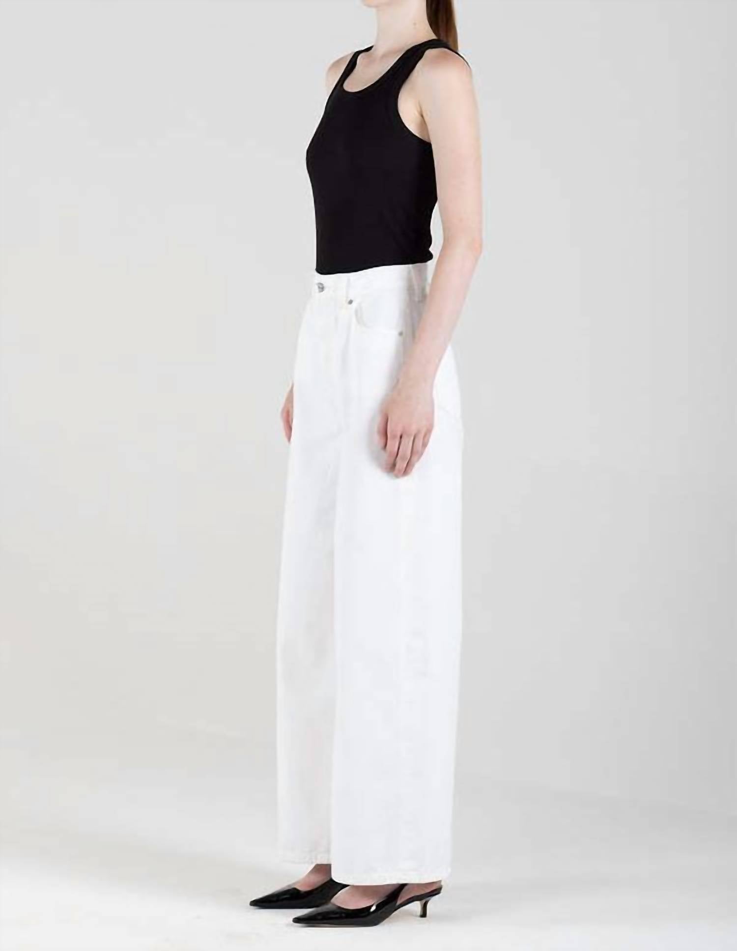 Pair these wide leg jeans with mules, slides or your favorite strappy sandals. ETICA's Marley Ultra High Rise Baggy Jeans in Vintage White are a nod to '90s fashion with a sophisticated twist. These wide-leg jeans feature a solid pattern and a relaxed fit, providing a flattering silhouette with a 13" rise and a roomy 25" leg opening. Composition: 64% Cotton, 36% Lyocell. Closure: Zip closure. Care: Machine wash cold with like colors, line dry, do not bleach, and warm iron if needed. With a 29.5" inseam, these jeans are designed for both comfort and style, ideal for a dinner party this Spring. The model wears a size 26.
