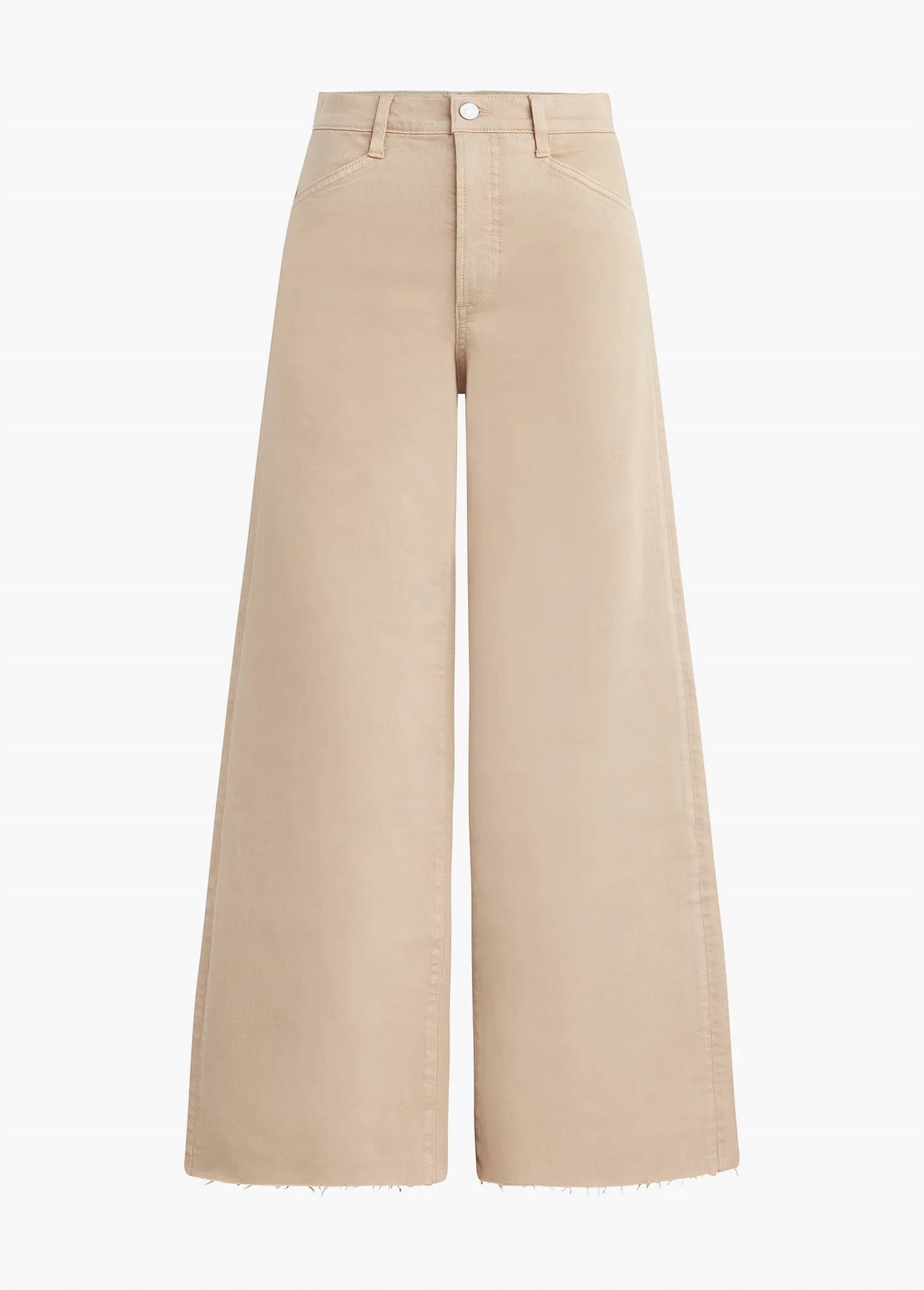 Warm Sand chic jeans. Feature a relaxed fit with a wide leg. Fitted at the hip with a slightly pinched waist. Substantial 11.5" rise and 29.5" inseam. Crafted from 91% Cotton, 7% Polyester, and 2% Elastane Twill. Promise comfort and style. With a button closure. Designed to be machine washed, care is easy, simply tumble dry. Providing a sophisticated profile below the ankle.