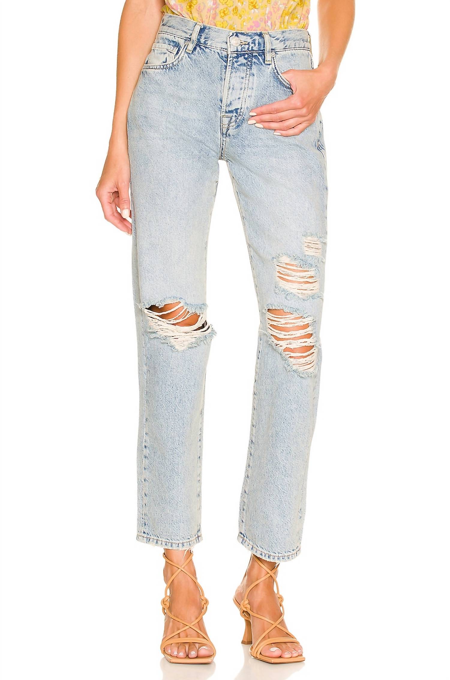 Discover the Bren Boyfriend Jean by Free People in a sunbleached hue, crafted for laid-back style. With a high-rise and boyfriend fit, these jeans feature a zip closure and 5-pocket styling, complete with light whiskering and destroyed detail. Composition: 65% Cotton, 35% Lyocell. Origin: Made in Turkey. Care: Machine wash, tumble dry. Measurements: 28.5" inseam, 10" rise, 16" knee opening, 14" leg opening.