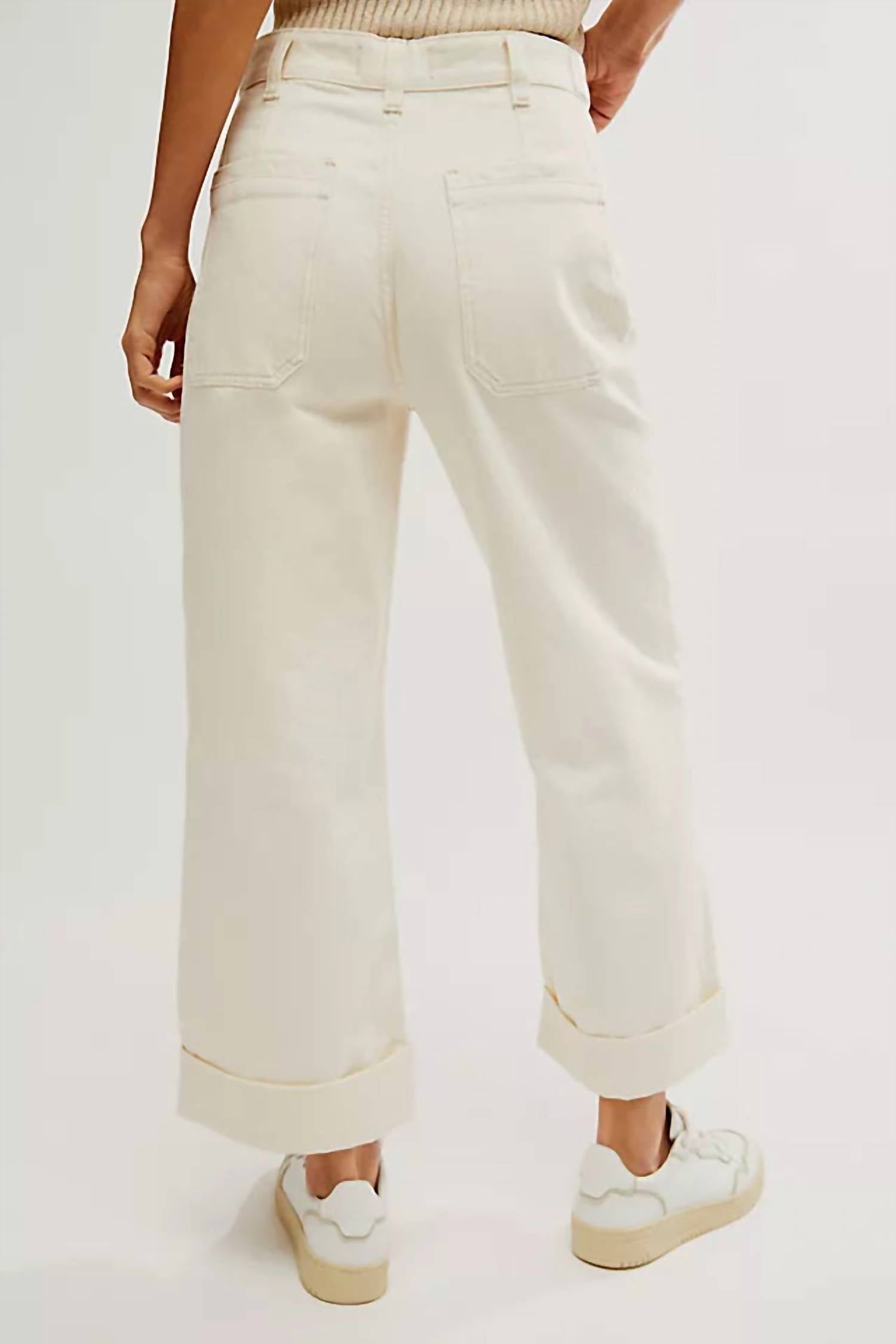 Introducing the Flair Cuffed Jean by Free People, a staple for relaxed style with its flared leg and mid-rise fit. These eggshell jeans, crafted from 100% cotton, feature nonstretch denim for a classic feel. Practical details include front and back patch pockets, adjustable side button tabs, and a zip fly with button closure. With a 31 1/2" inseam, machine wash these imported jeans and tumble dry for easy care.