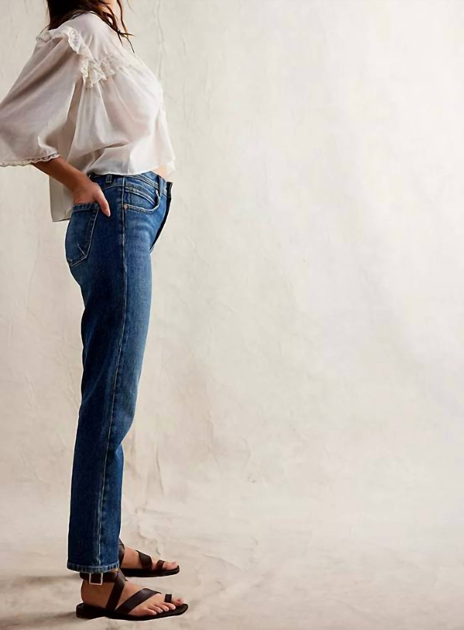 This classic straight leg jean has a perfect fit and goes with just about everything. Introducing the Leila High-rise Leggy Slim Jeans by Free People, a timeless piece from their We The Free collection, designed for effortless style. These women's jeans feature a high-rise, slim fit in a Cupid Blue textured finish, with an ankle-length inseam for a sleek look. Made from a cotton blend of 79% Cotton, 20% Recycled Cotton, and 1% Elastane, these jeans boast a five-pocket design and secure with a zip fly and button closure. Care is simple with machine wash cold instructions, making them perfect for travel and everyday wear.