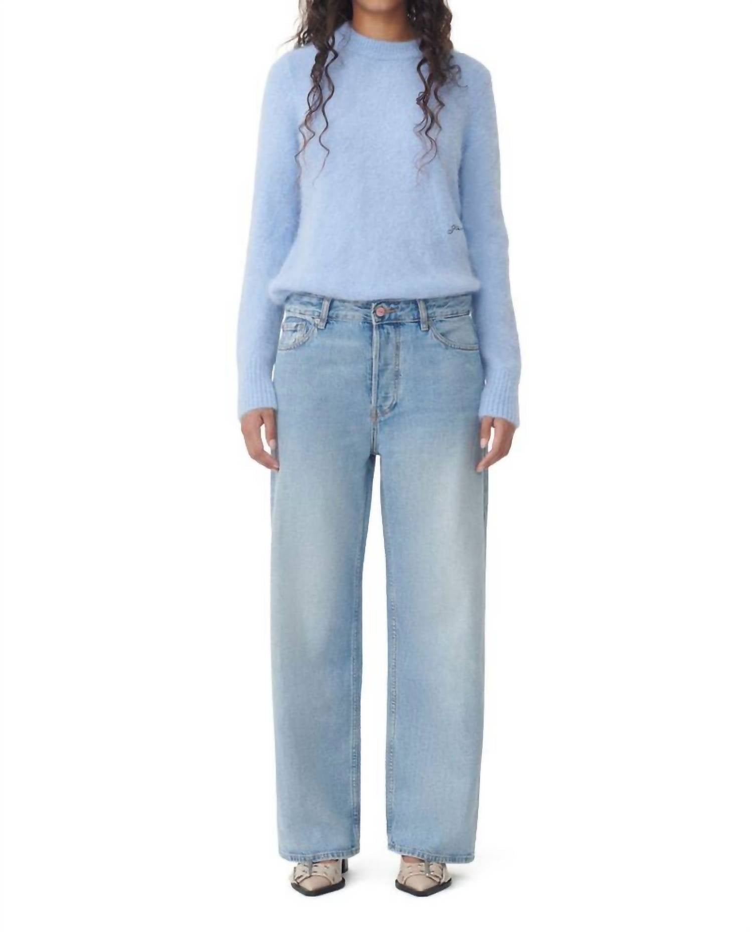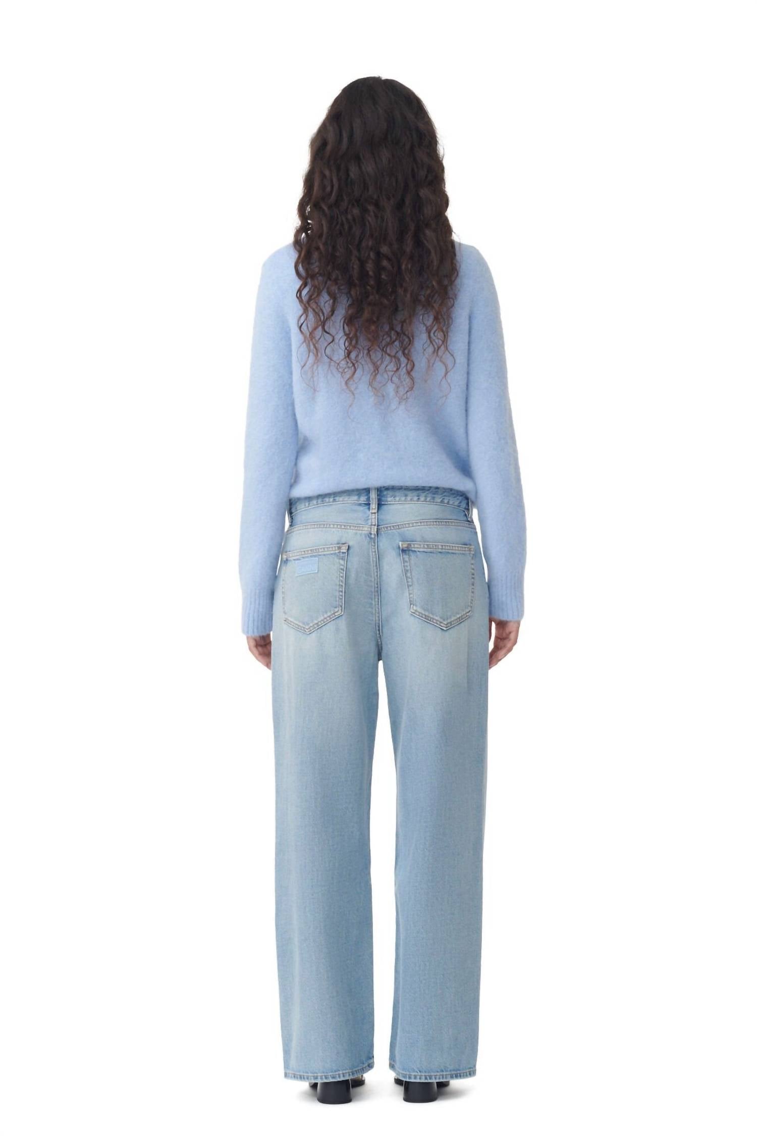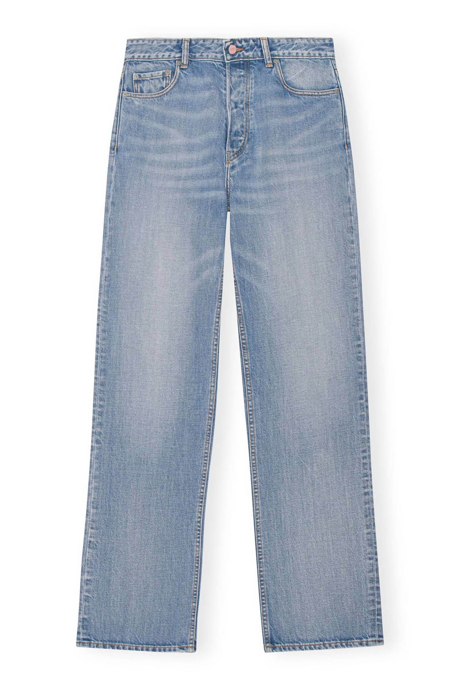Pair these straight leg jeans with flats, sandals or even heels! You can't go wrong. Crafted from 100% organic cotton for a comfortable and sustainable choice. Straight-leg jeans feature a relaxed fit with a high-rise waist and a classic 5-pocket style. Button closure and signature GANNI logo at the back pocket add distinctive elements to this solid color design. Embrace effortless style with these versatile jeans, ideal for various occasions.