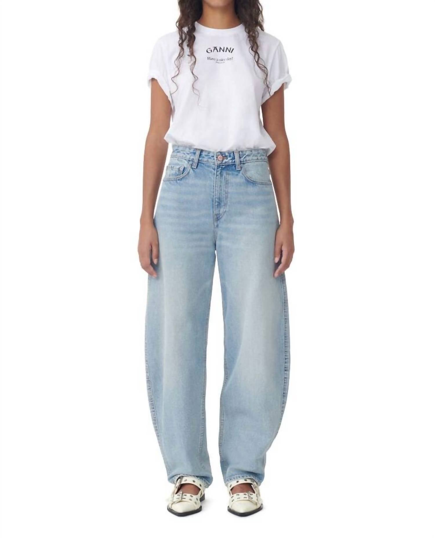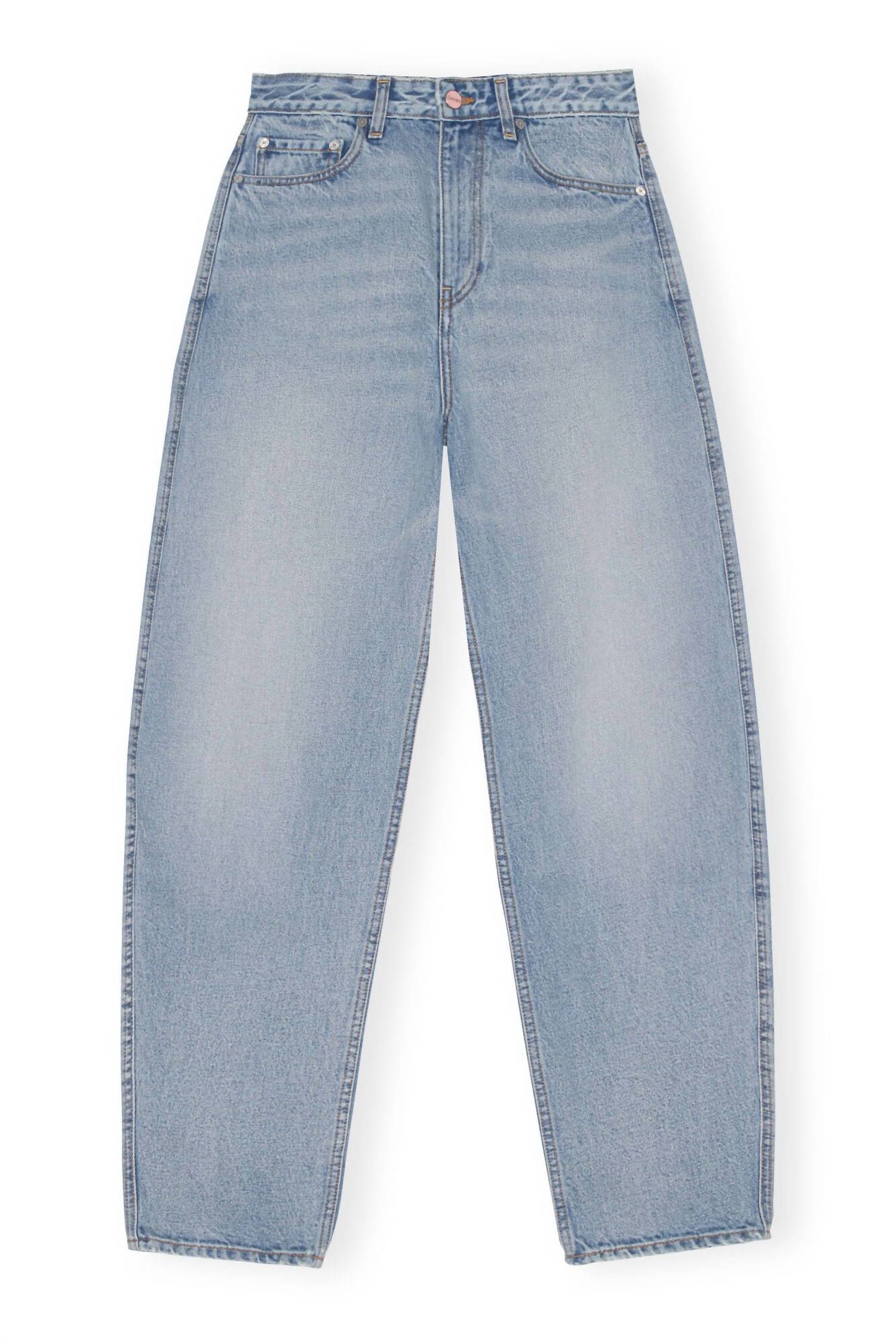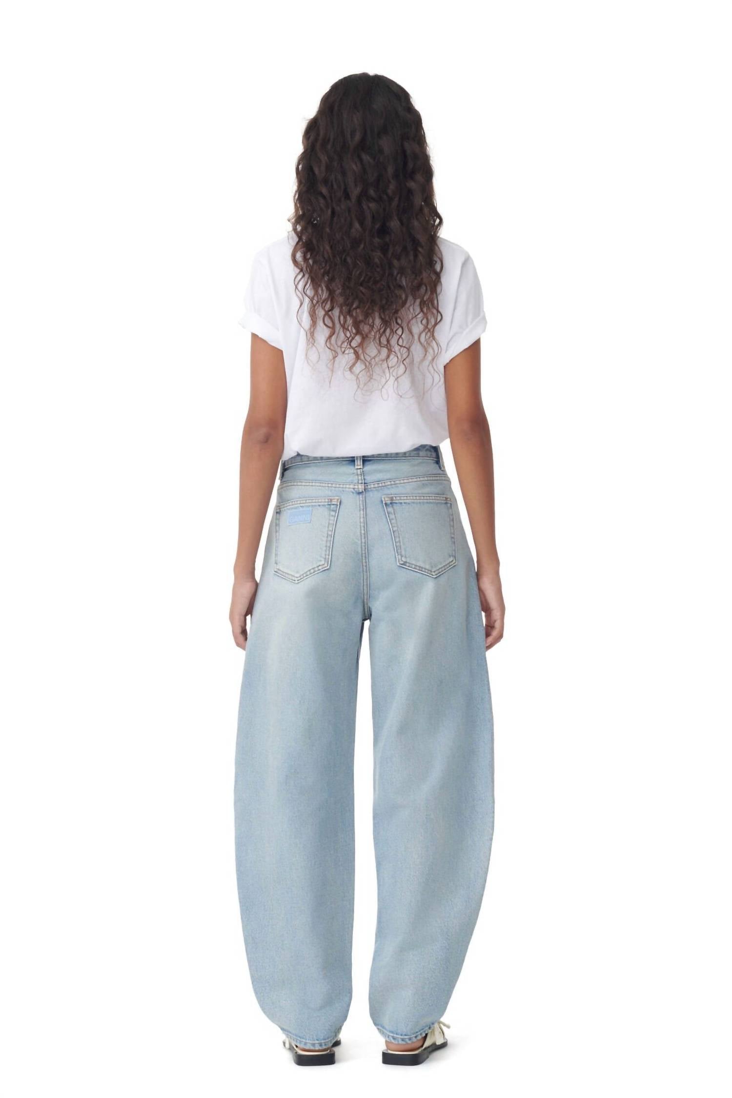 Just as cute as they are comfortable. Captivating Light Blue Vintage hue, crafted entirely from 100% organic cotton. Boast a high-rise waist with a relaxed fit through the hips and thighs. Featuring a curved-leg silhouette. Closure is ensured with a classic 5-pocket style complete with belt loops and a zip/button closure for secure wear. Complete with the iconic GANNI logo at the back pocket. Offer a unique blend of comfort and style.