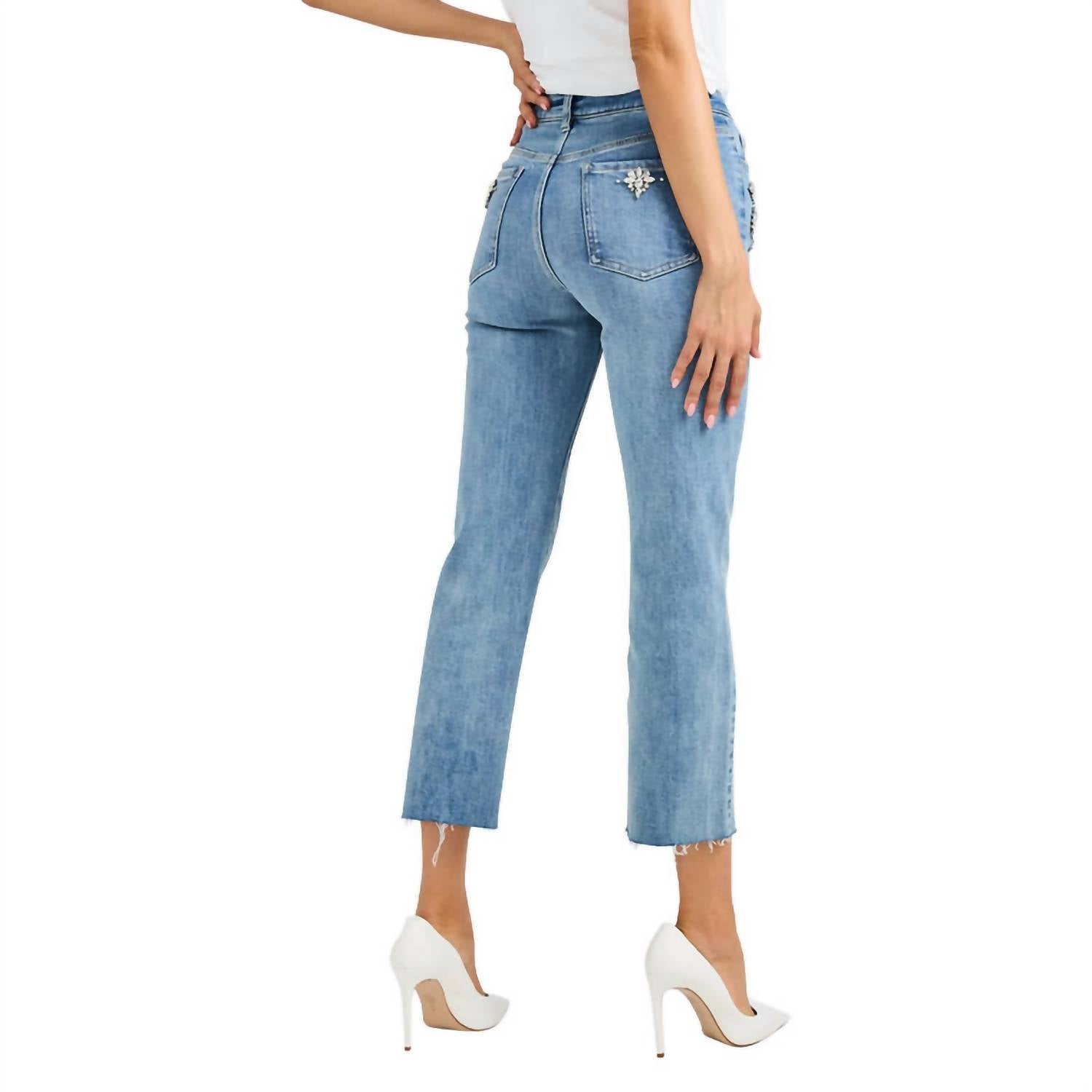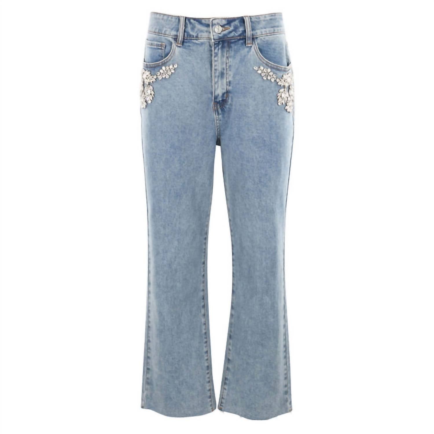 This classic straight leg jean has a perfect fit and goes with just about everything. Elevate your casual wardrobe with the Carolyn Crystal Embellished Jeans by Generation Love, crafted in a chic Bahama Blue. Featuring a high-rise, regular fit, these jeans add a glamorous touch with crystal embellishments on the front pockets. Made from a cotton blend of 91% cotton, 6% polyester, and 3% elastane, they offer comfort and slight stretch for everyday wear. With a shank and zipper closure, and an inseam of 27 inches, these jeans promise both style and function. Care: Spot clean only.