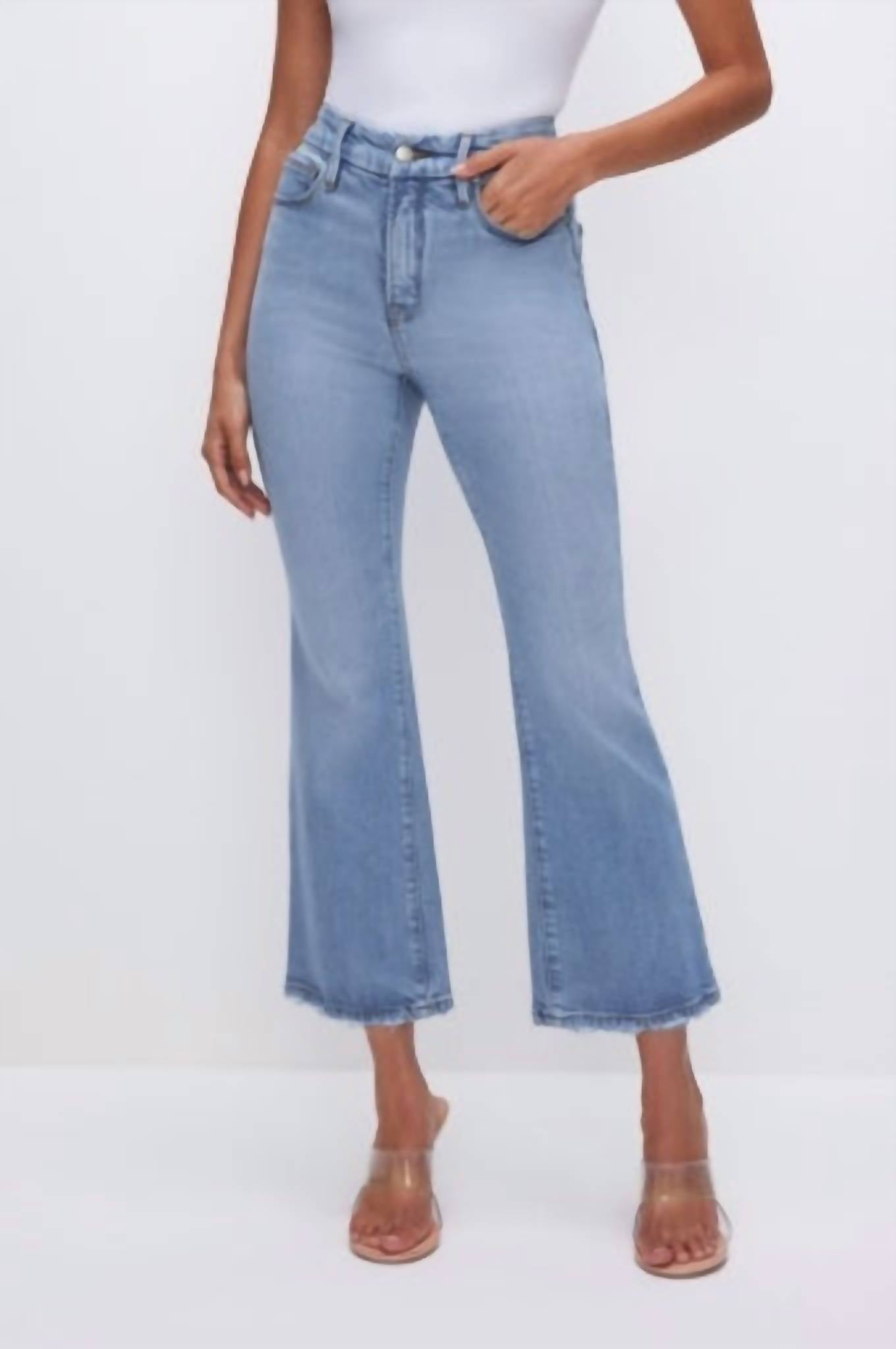 Stay on trend with these stylish boot cut pants that are fit to perfection. The perfect combination of comfort and fashion, you'll be grabbing for these all season long! Introducing the Good Legs Crop Flare Jeans by GOOD AMERICAN, offering a chic addition to your wardrobe in a solid indigo hue. These jeans boast a stylish flared leg and convenient zip closure, with pockets for added functionality. Crafted from a viscose blend consisting of 48% Lyocell, 47% Viscose, 4% Polyester, and 1% Elastane, they provide comfort and flexibility. Care instructions recommend machine washing cold for ease of maintenance.