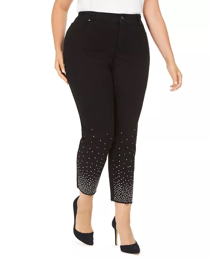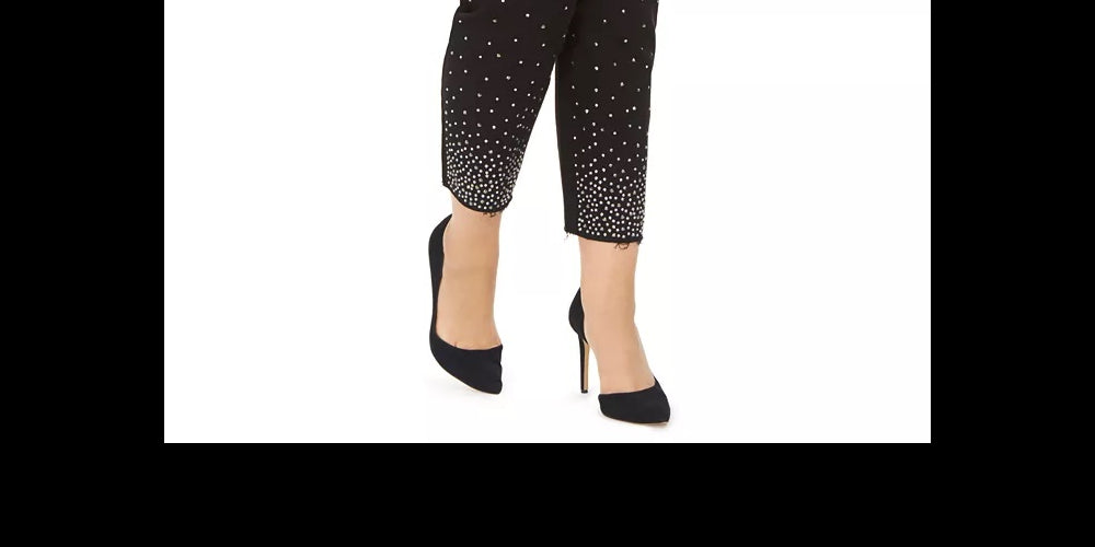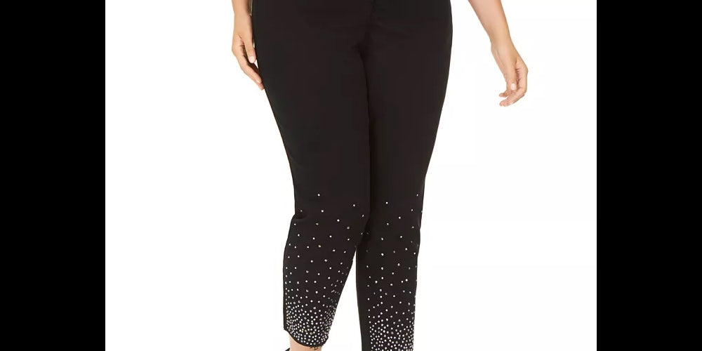 Approx. inseam; 27-1/2|Mid rise; skinny leg|Front zip and button closure; belt loops|Crystal embellishments at lower front leg|Cotton/polyester/rayon/spandex