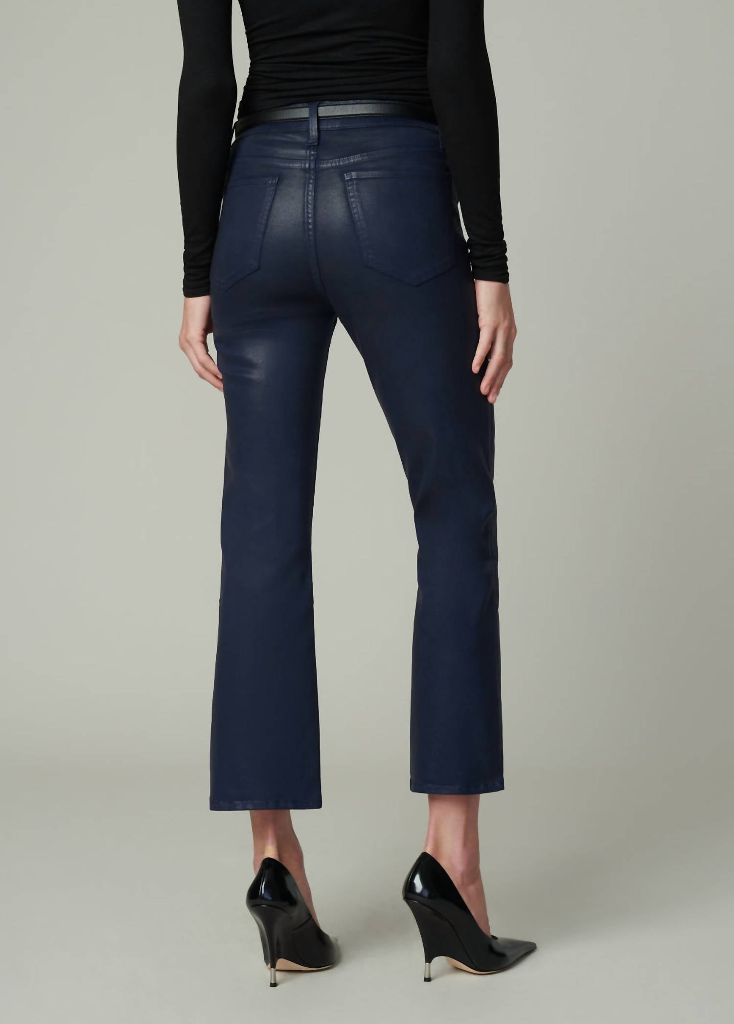 If you're looking for boot-cut, this is the jean for you. Elevate your wardrobe with the Callie Coated Bootcut Jeans from Joe's Jeans, featuring a high rise fit and classic bootcut leg. Designed in a chic navy, these jeans offer a slim fit through the waist, hips, and thigh, boasting a crop length with a 26.5" inseam. Crafted from a cotton blend, this solid pattern piece includes a convenient 5-pocket styling and secures with a zip fly and button closure. Care is effortless with machine wash and tumble dry recommended.
