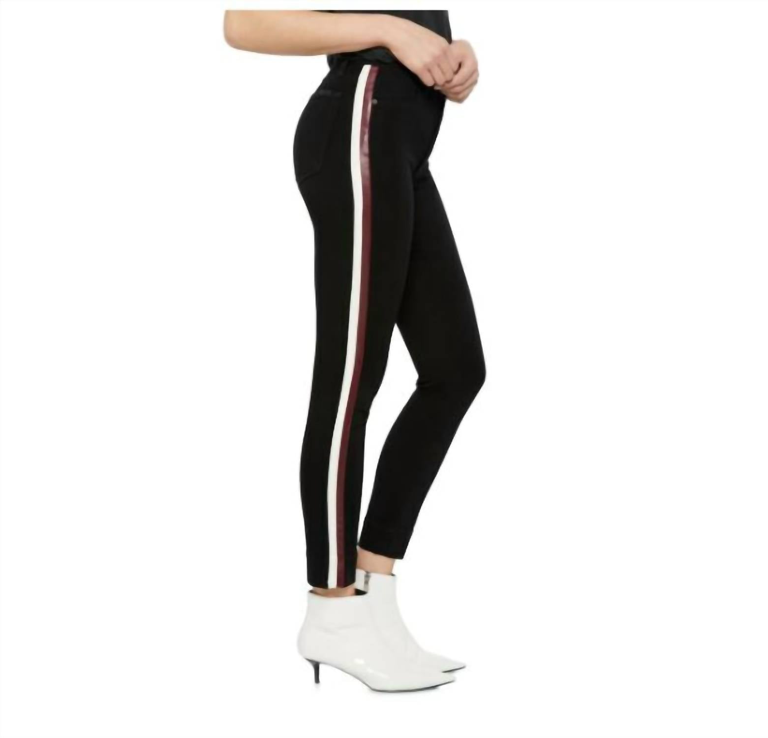 The perfect skinny jeans to wear with your favorite boots this season! Introducing the Charlie High Rise Side Faux Leather Stripe Skinny Jeans by Joe's Jeans, a perfect blend of sleek style and sporty flair. These figure-sculpting skinny jeans highlight a flattering high waist, enhanced by two-tone faux leather side stripes for a contemporary edge. Composition includes 56% rayon, 25% cotton, 18% polyester, and 1% spandex, complemented by leather trim. Inseam: 27". Front Rise: 9.5", Back Rise: 13.5", with a Leg opening at hip: 9" and a Waist measurement of 12.5". Closure: Zip fly with button. Pockets: Front scoop and back patch pockets. Care: Machine wash, dry flat.