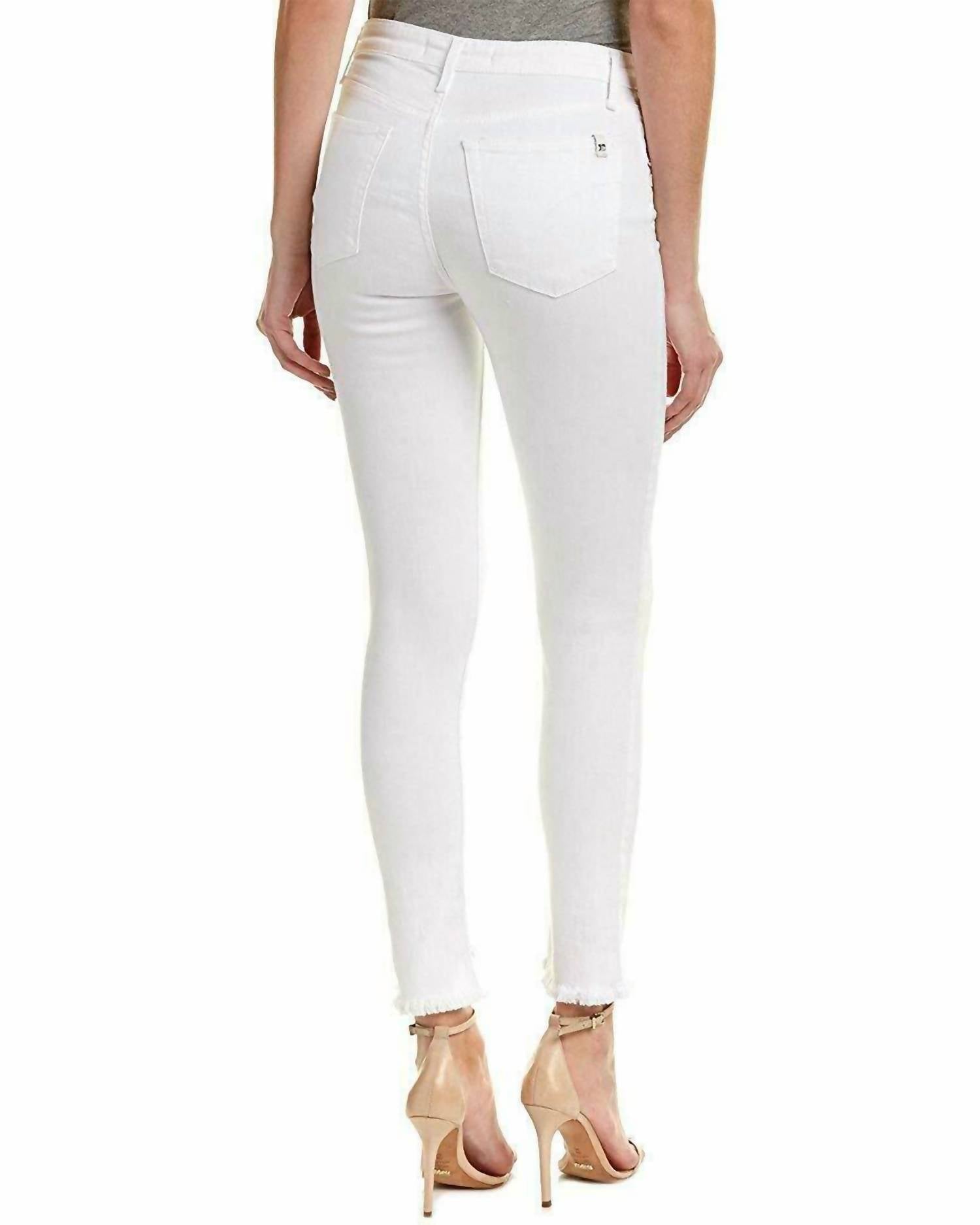 Everyone needs a good pair of skinny jeans and this is a style you'll keep reaching for no matter the season. Introducing the Flawless Ankle Slanted Raw Hem High Rise Skinny Jeans by Joe's Jeans in sleek white. These women's jeans are crafted from an ultra-soft stretch denim blend, featuring 48% cotton, 45% lyocell, 5% T-400, and 2% spandex. They sport a high rise with a front rise of 11" and back rise of 15", include five pockets alongside a zip fly and button closure. The jeans have an inseam of 28", with a leg opening at the hip measuring 11", and a waist of 15.5". The slanted raw hem and solid pattern add distinctive style, augmented by the easy-care machine wash cold instruction.
