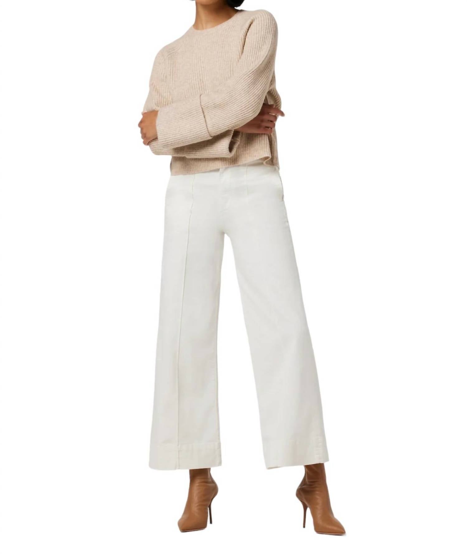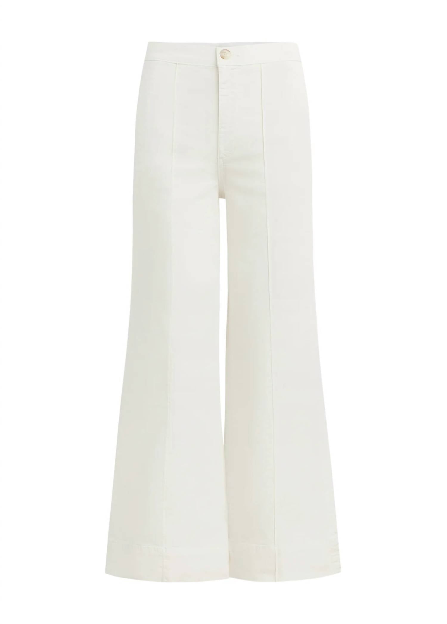 This ankle-length trouser features wide hems, a clean front, and front creases for a polished, crisp look. Made from 78% cotton, 18% modal, 3% elastomultiester, and 1% elastane, it offers both comfort and style. The measurements include an 11.5-inch rise, a 27-inch inseam, and a 22.75-inch leg opening. Please note that this trouser runs small. The model is wearing a size 26. For care, machine wash in cold water.