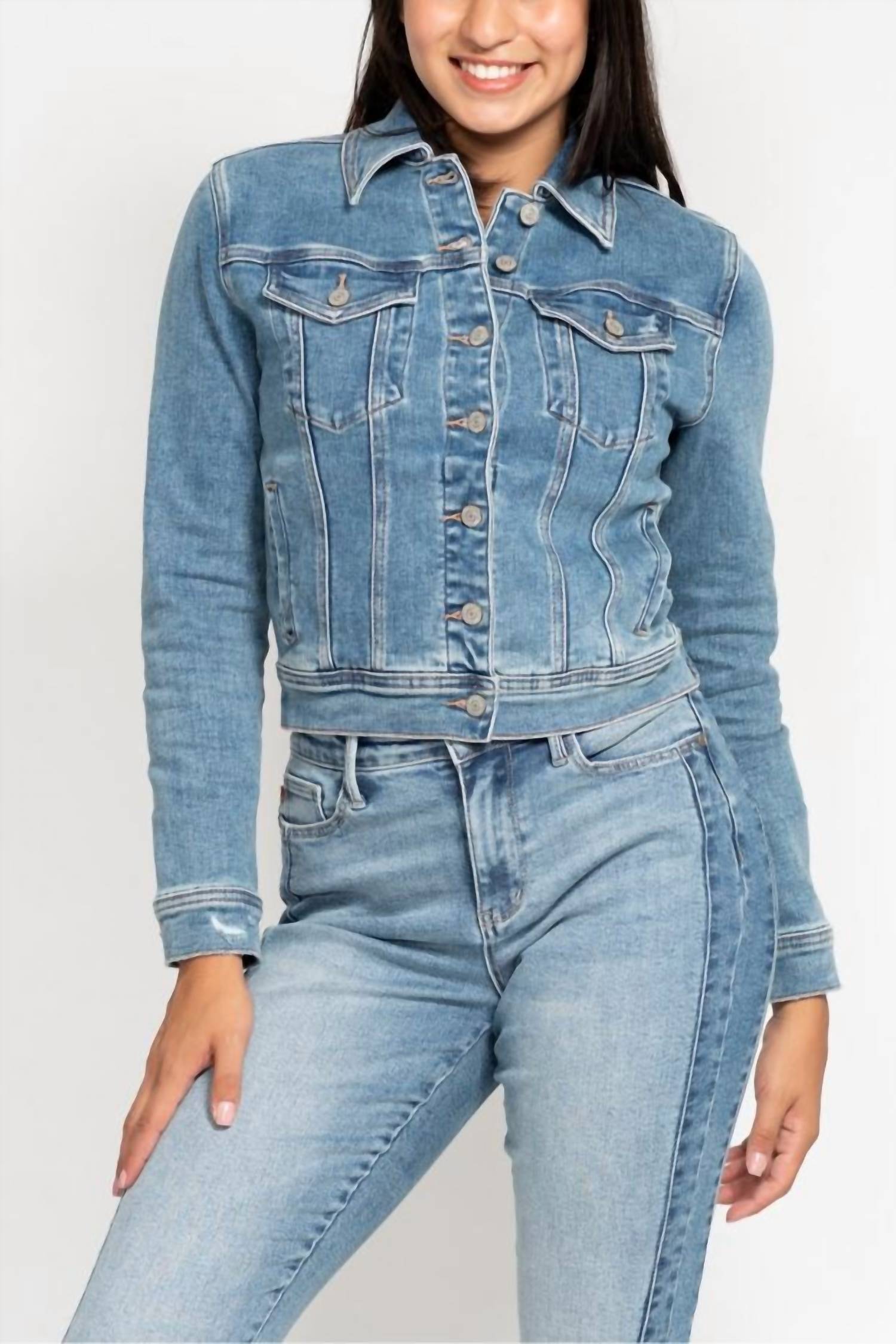 A jacket so versatile you can literally wear it with anything. Vintage-inspired denim jacket. 76.2% cotton. 22.5% polyester. 1.3% spandex. Comfort and stretch. Length: 21 1/2". Classic, timeless look.