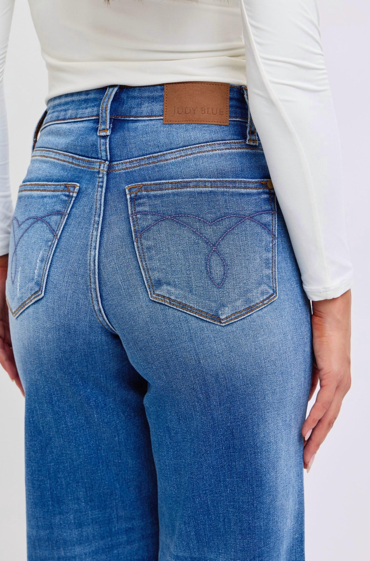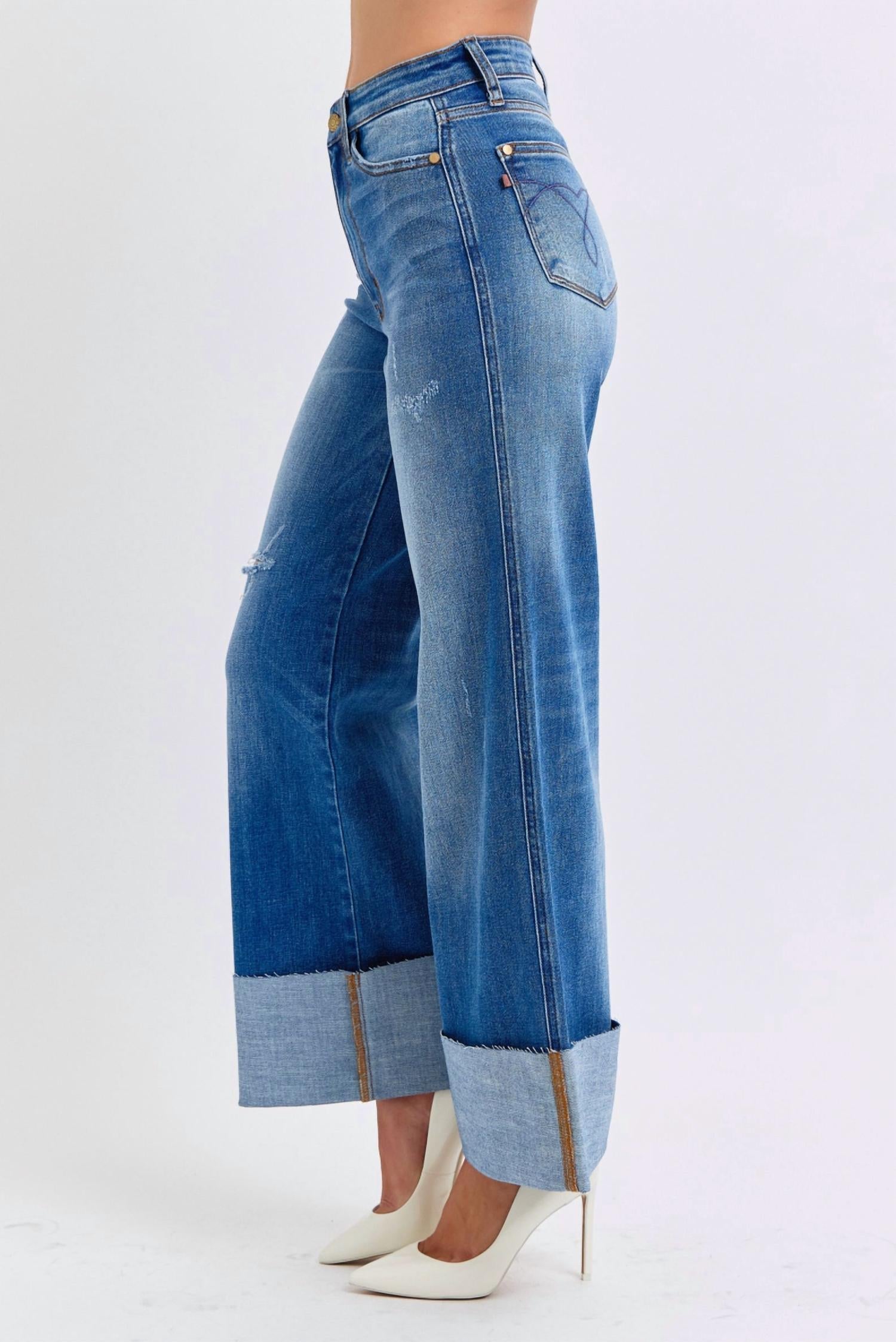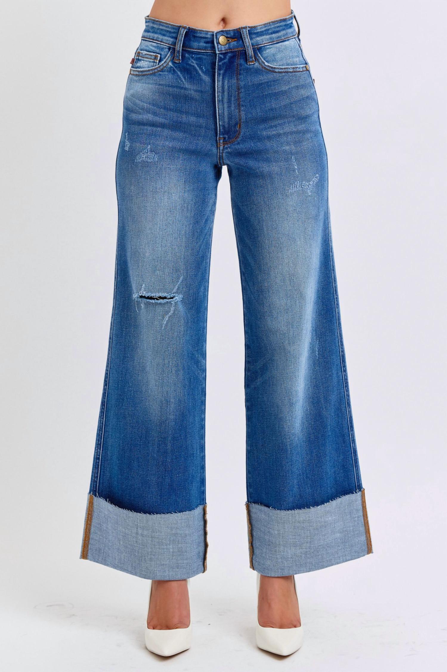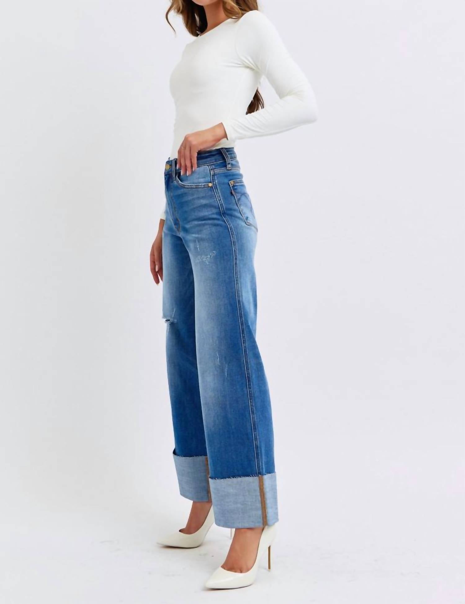 Stylish classic medium wash. Designed with a high-waist rise and tummy control for a flattering silhouette. Feature a relaxed, wide-leg fit. Composition includes 69% Cotton, 16% Polyester, 9% Rayon, 5% Elasterell-Poly, and 1% Spandex. Offering both comfort and stretch. Dimension measures Rise 11", Inseam 29" cuffed and 34" uncuffed. Machine wash, tumble dry. Perfect for a timeless yet modern look.