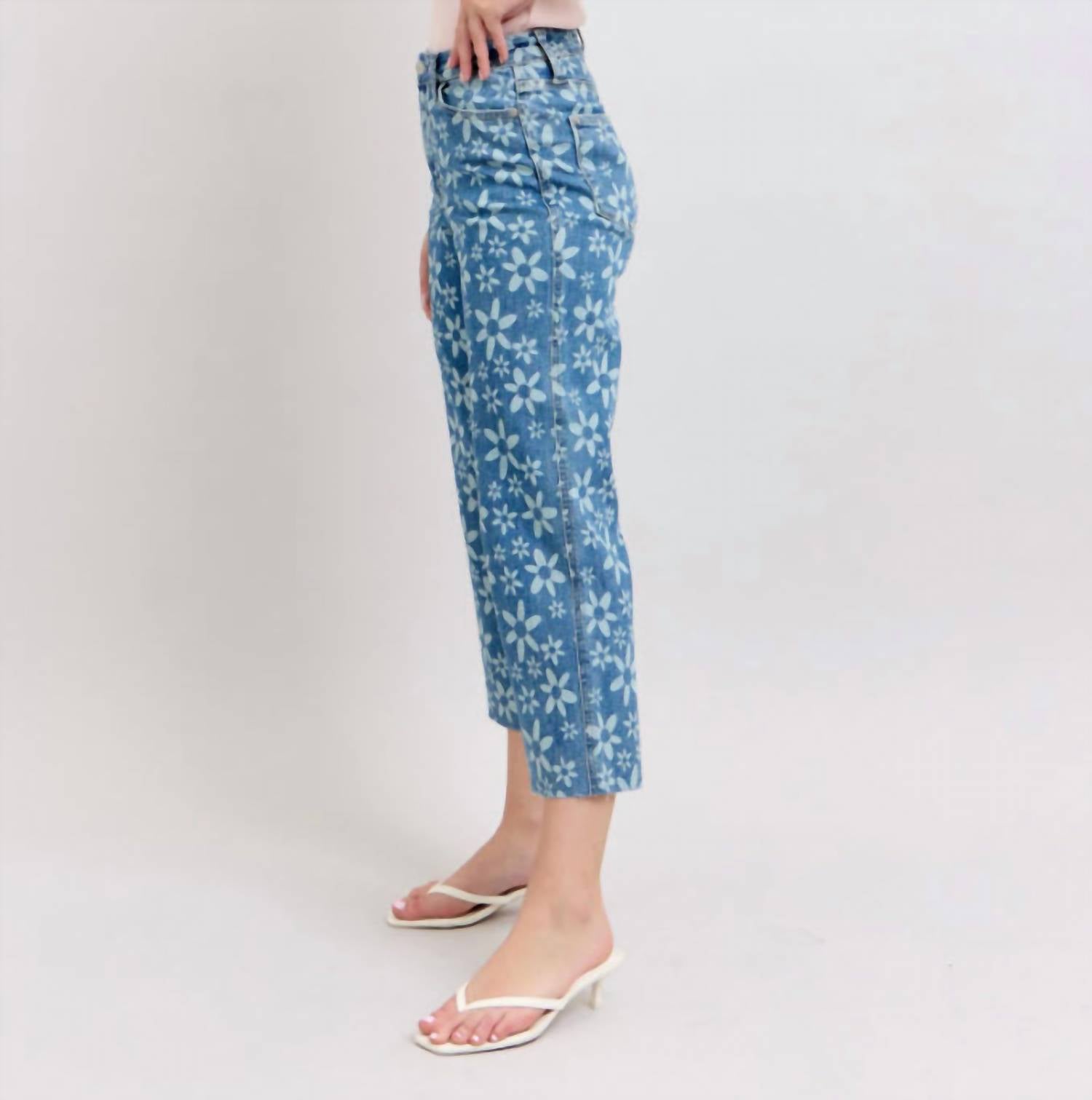 A flattering silhouette that's suprisingly versatile. Step into playful elegance with the High Rise Flower Print Crop Wide Jeans by Judy Blue, a perfect blend of quirky charm and modern style. Crafted with a composition of 92% Cotton, 6% Polyester, and 2% Spandex, these jeans boast a relaxed fit with a bold floral pattern. With a high-rise waist of 10.75 inches and a cropped wide leg, they provide an inseam of 24.5 inches. Featuring a button closure and convenient pockets, these jeans are easy to care for with machine wash instructions. Model is wearing size 25.